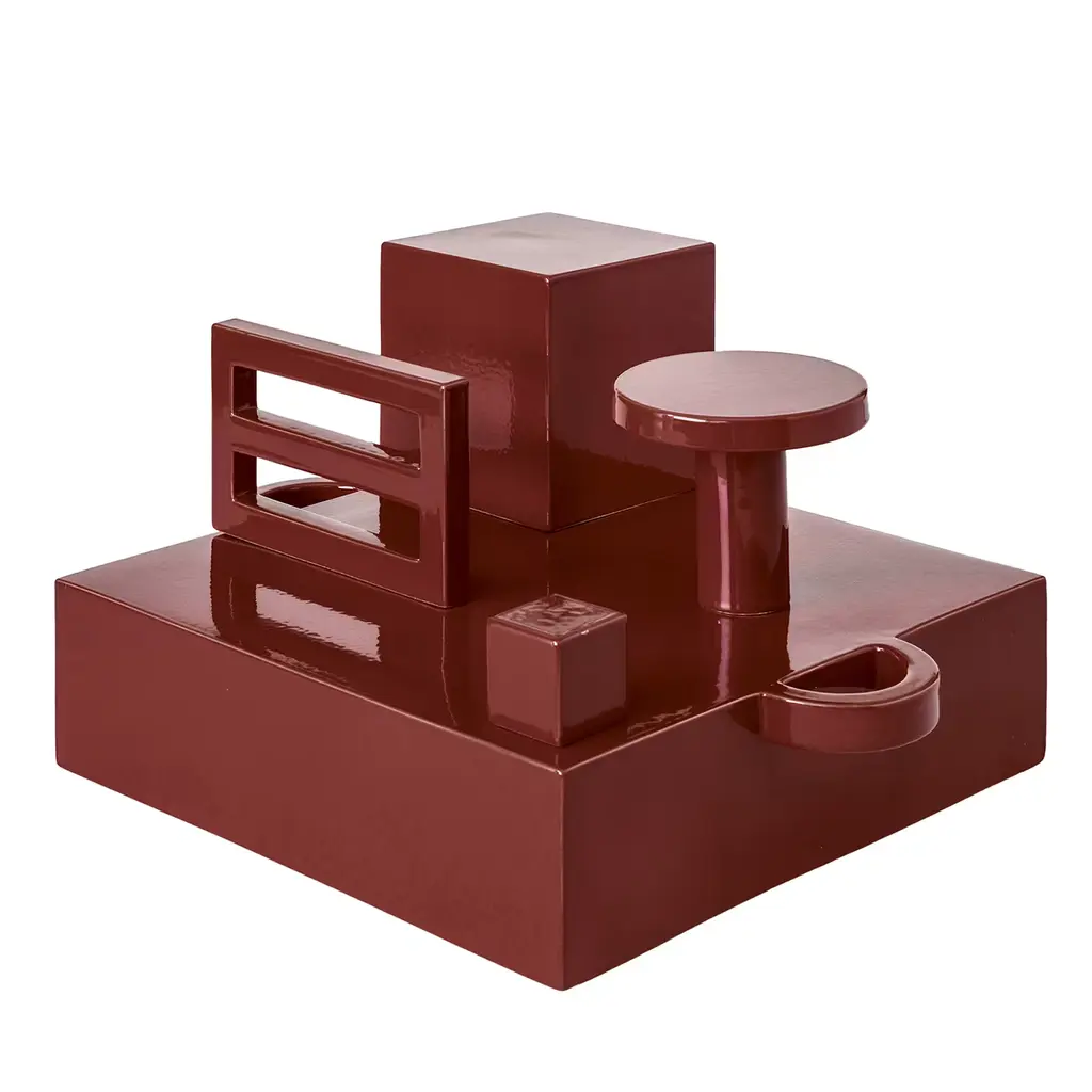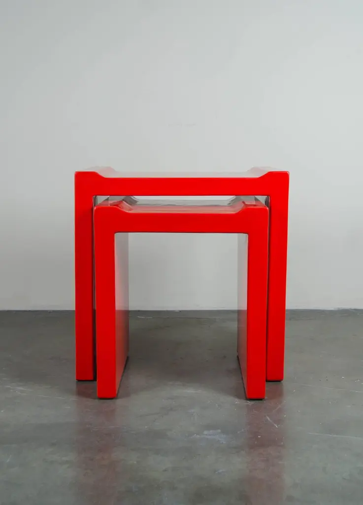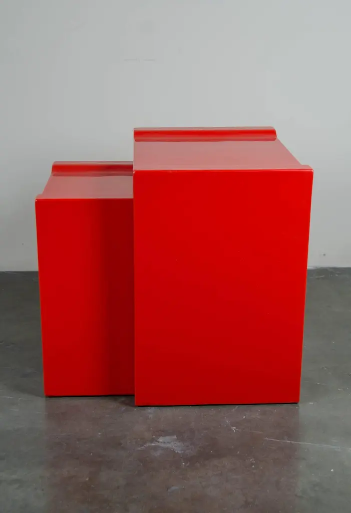 Nesting table with flange cornersRed lacquerHandmadeSet of twoLimited editionMeasures: Large table: 23" W x 16 1/4" D x 23 3/4" HSmall table: 17 1/4" W x 16 1/4" D x 20 1/2" H.Lacquer is a technique that dates back to the Shang dynasty, circa 1600-1100 B.C. These pieces are made with at least 60 coats of organic lacquer. Each layer of lacquer is applied with a curing period of 24 hours in between so that it can dry. Each piece is individually crafted and is unique. Natural imperfections and inclusions may show on the lacquer.