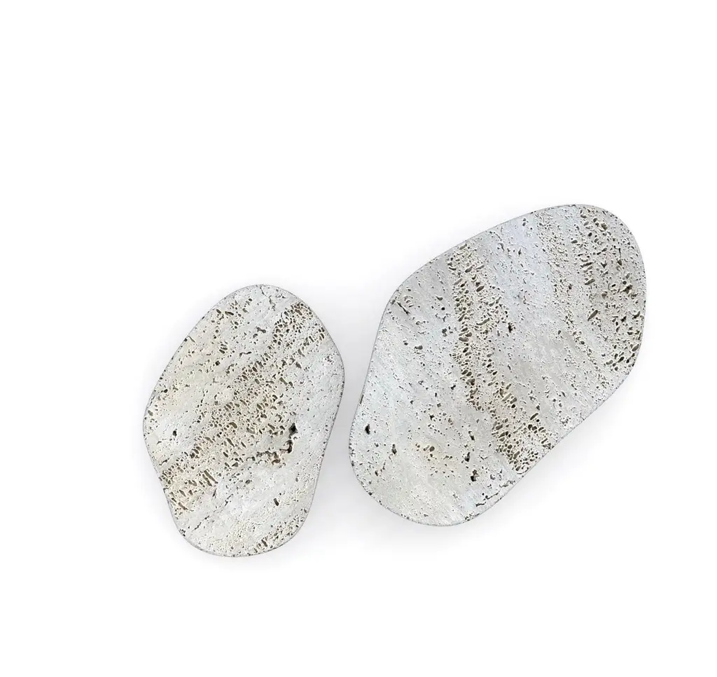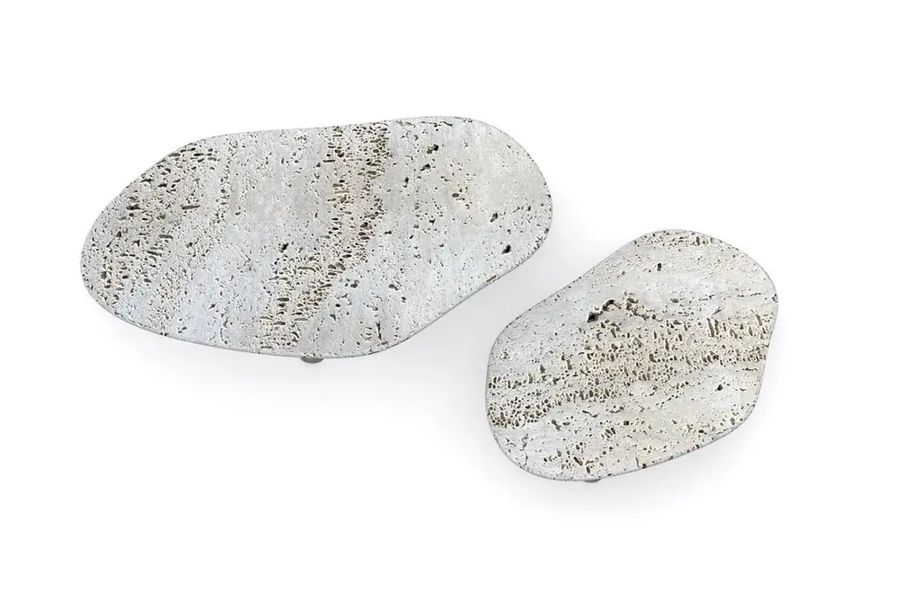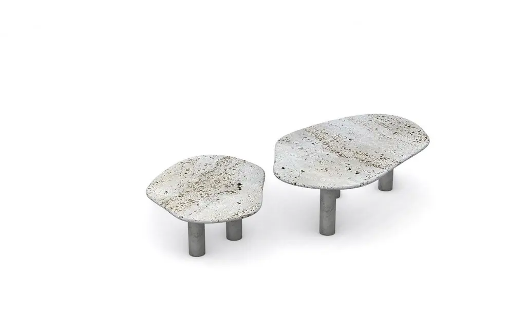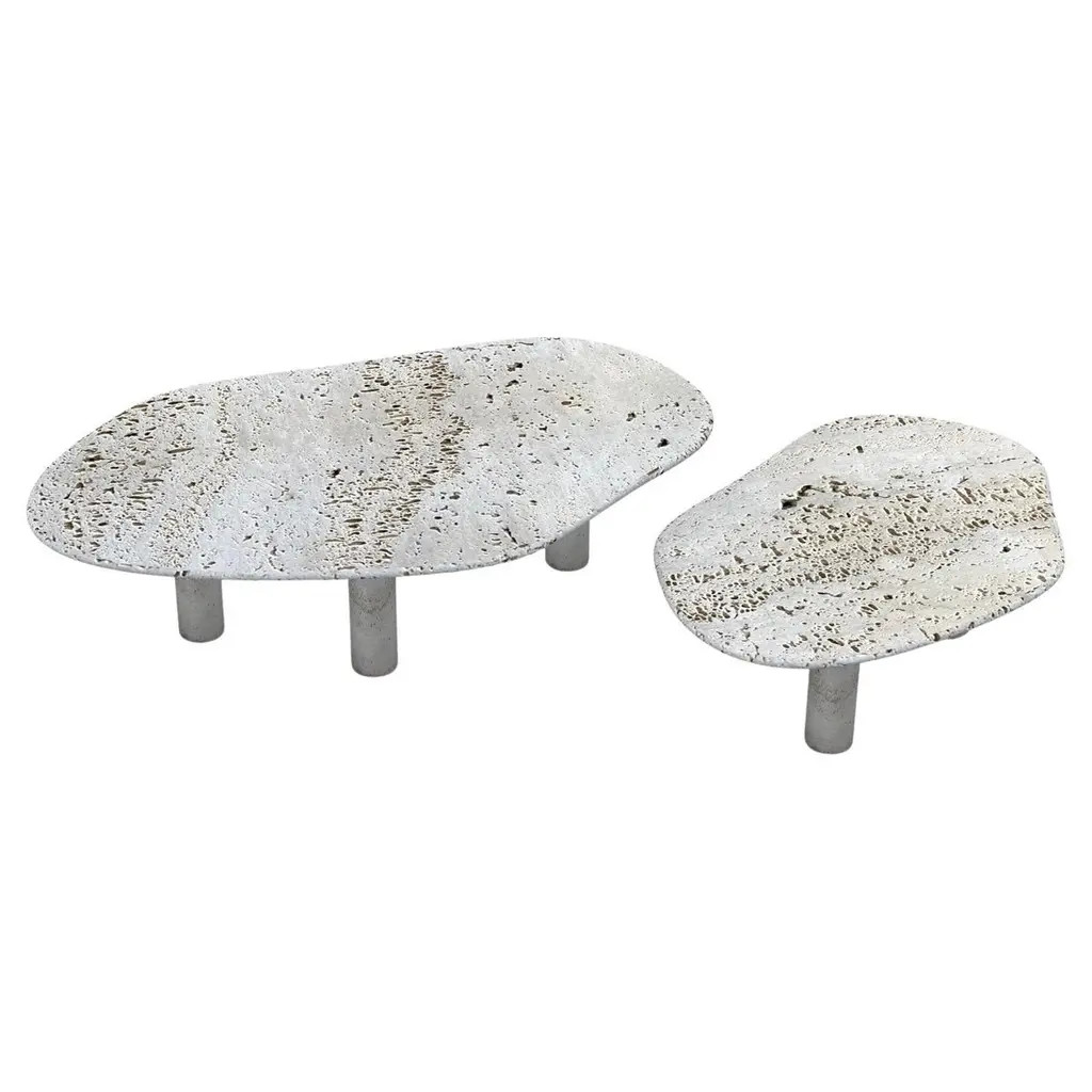 An organic shaped nesting table made of Honed Travertine surface and matching solid travertine legs.The larger table is 15"H and the smaller table is 13"H - a beautiful nesting of precious stone that allows for a larger or smaller footprint. The larger table is 50" x 36"The smaller table is 42" x 24"The travertine tops feature softened edges on the sides to create truly smooth and sumptuous furniture pieces that flow within your space. The organic shape of the table tops play with the natural variation in the stone and off of each other. The playfully asymmetric legs explore harmony and balance through proportions. The Oni Nesting Coffee Tables are a timeless blend of ephemerality and enduring craftsmanship and a perfect addition to any space.The tables can be customized in size and height.