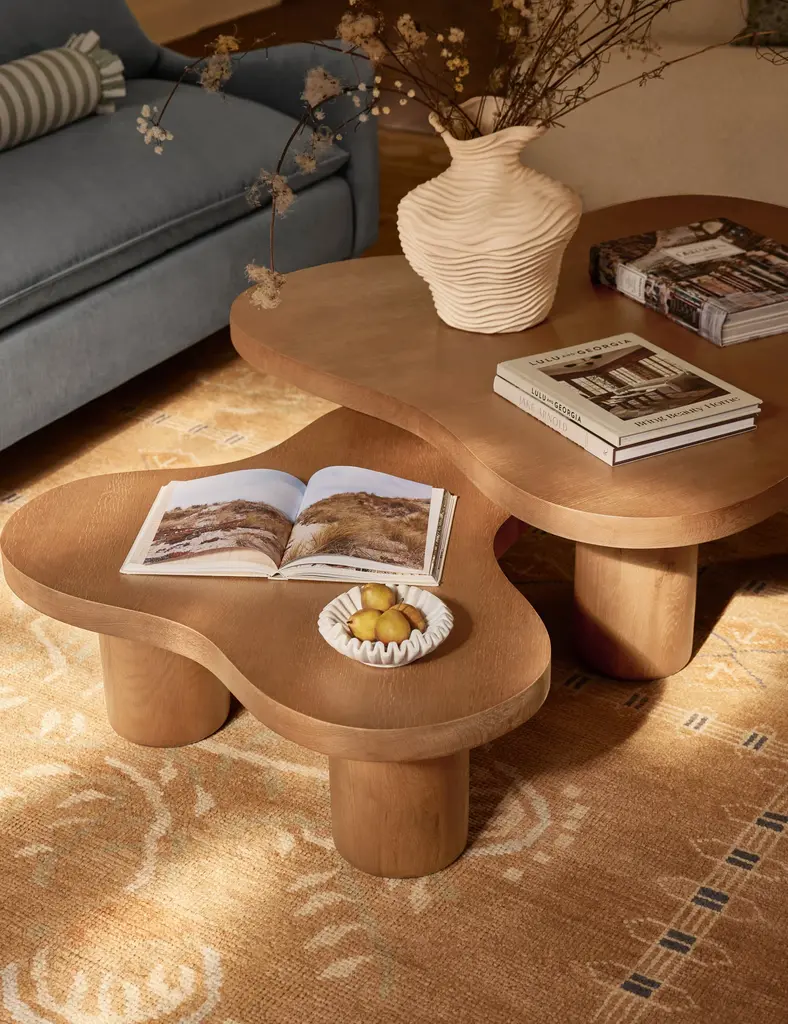 Our Ombra coffee table cuts a striking sculptural form in oak. Clean edges bring a crisp impact to the soft-lined silhouette, grounding your space with a modern edge. This wood coffee table showcases a beautiful natural grain for impact in your room. Style to scale or as a nesting set.