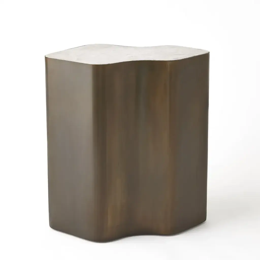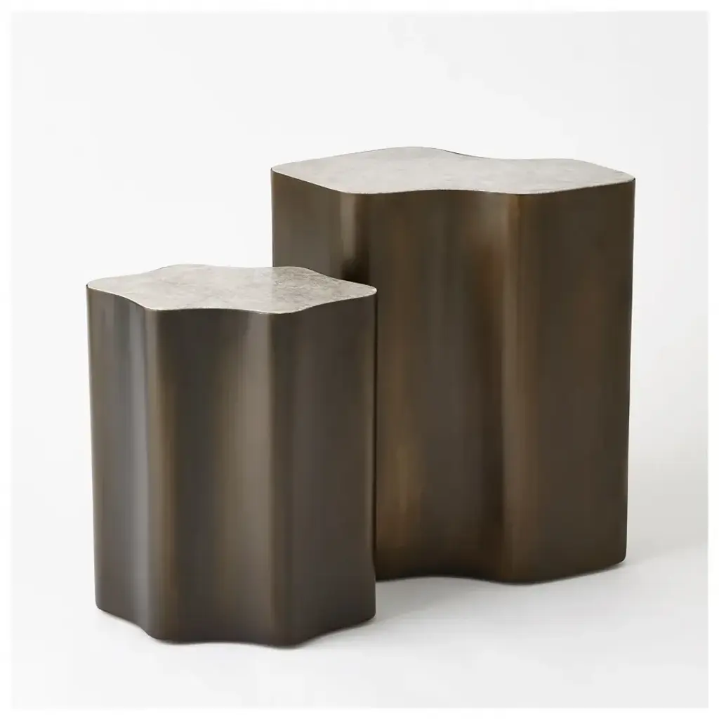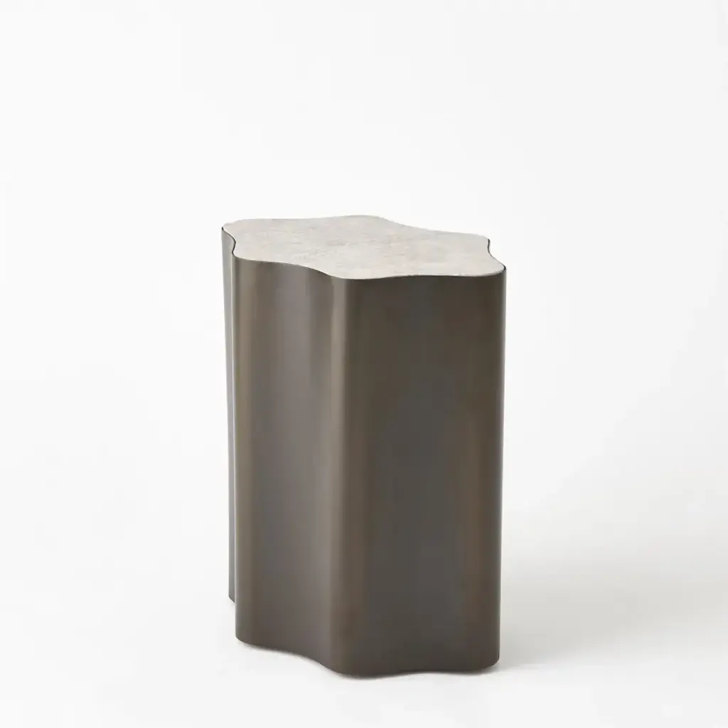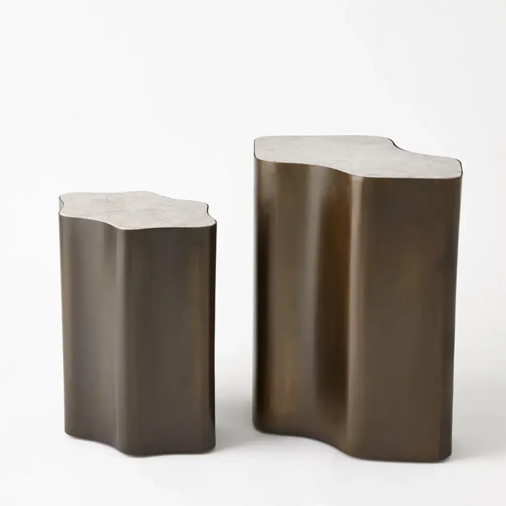 The form and shape of these nesting tables are organic and natural . Grey metal with a matching marble top are designed to be grouped together to create a harmonious feel while being asymmetrical. Available in 2 sizes. Each sold separately. From a fashion forward perspective, Global Views offers accessories, furniture, statement lighting, and an assortment of rugs and mirrors to add beauty and joy to your home.