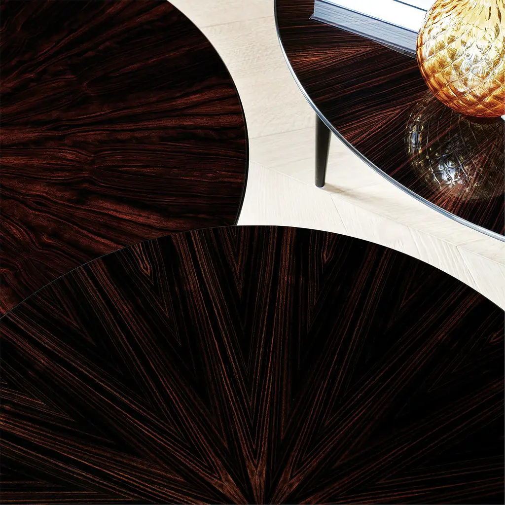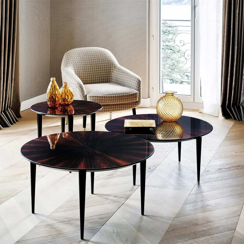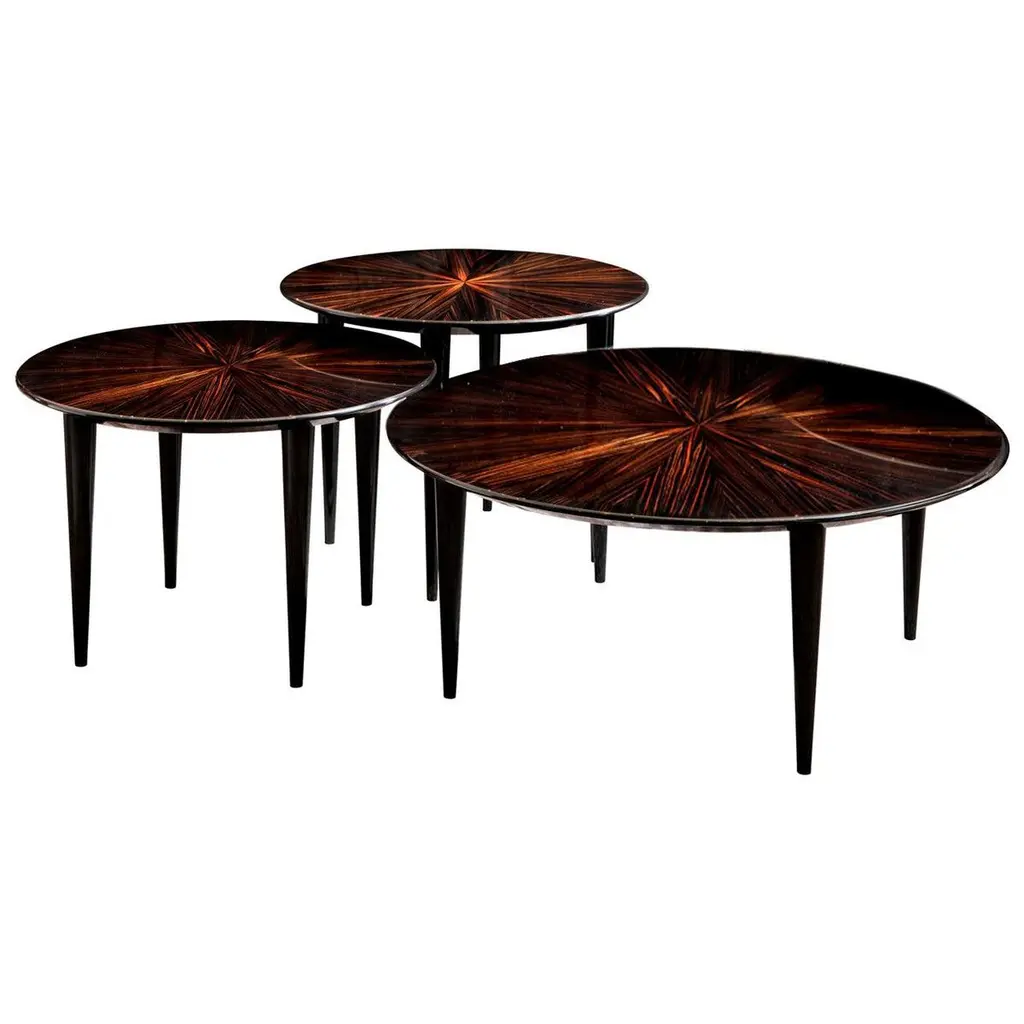 Part of the Pierrot series, this trio of coffee tables boasts exquisite craftsmanship and the use of prized Macassar ebony. The design of each piece, inspired by the romantic flair of the renowned French mask from which it takes its inspiration, is a delicate combination of round top and tapered legs, which are interchangeable and decorated with black glossy lacquer. The radial decoration on the tops is masterfully executed. The pieces measures: Ø80 x H35 cm, Ø56 x H40 cm, and Ø 56 x H45 cm.