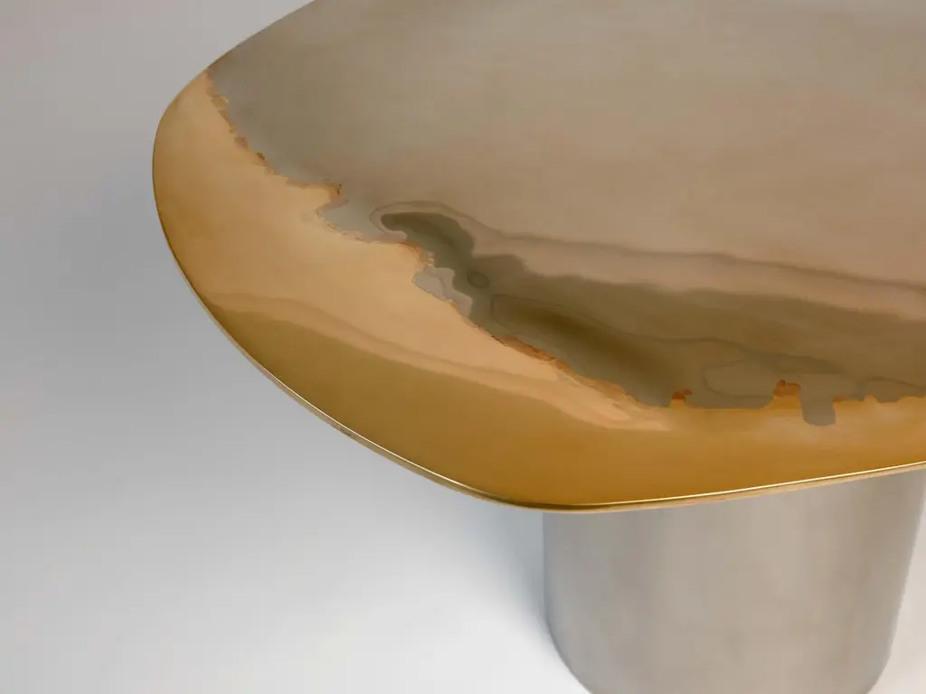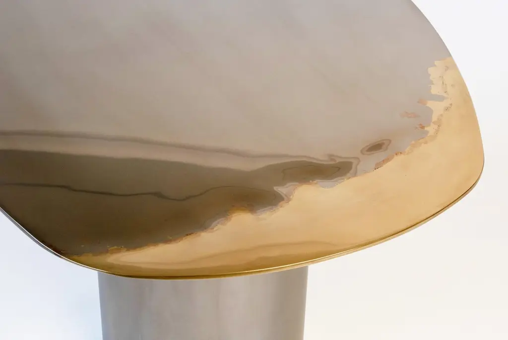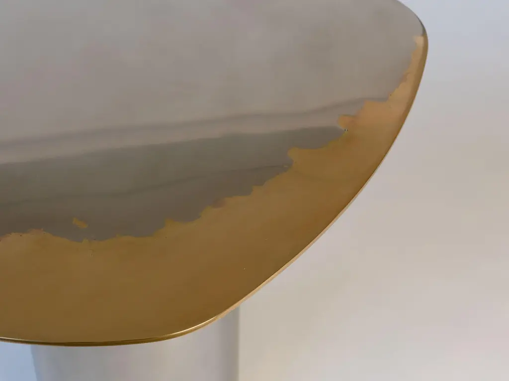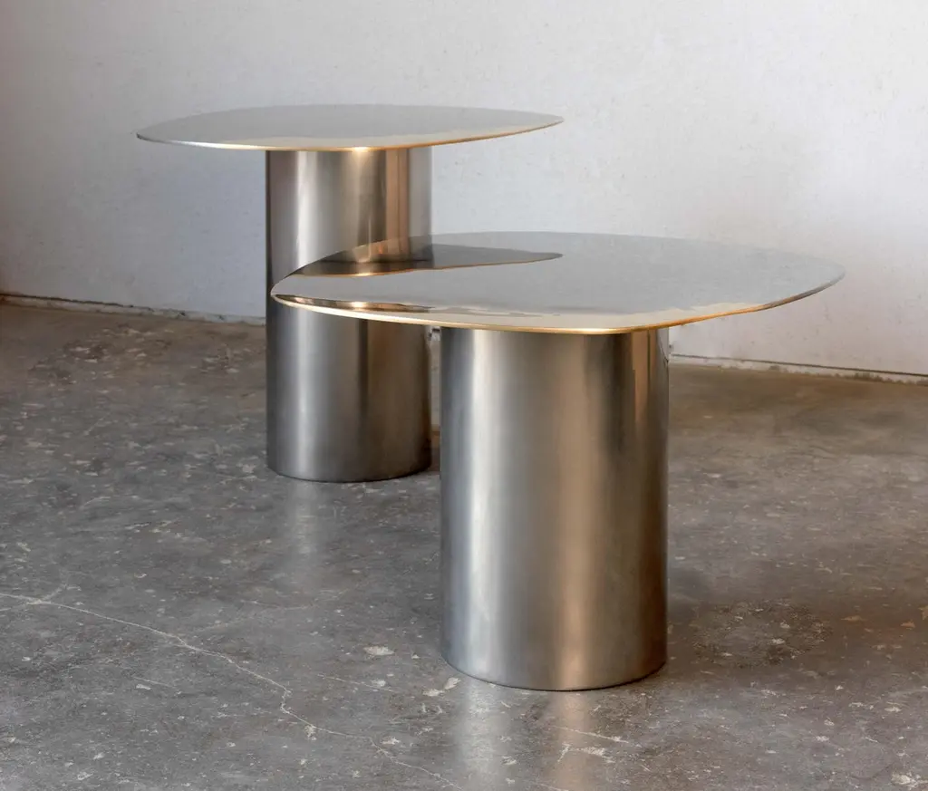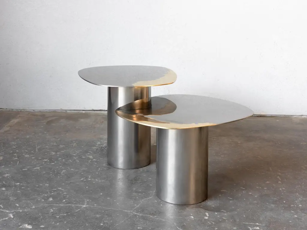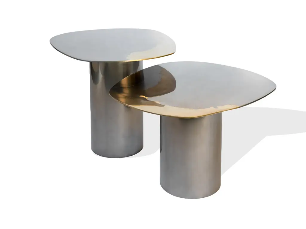 A set of nesting tables as part of the Transition collection, featuring unique, artistic mirror polished tabletops, crafted from brass and stainless steel on tubular bases. Studio Warm has developed a distinctive, high-end, artistic finish blending contrasting, raw materials. The handcrafted and hand finished process - reminiscent of crafting fine jewelry - merges brass and stainless steel to a seamless finish, providing a soft transition from brass to stainless steel and vice versa. Due to their different shrink rates, a subtle waviness may appear, this phenomenon will seem very apparent at times and seem to disappear at others depending of the angle of reflections and sunlight. The process creates an entirely unique finish, perfect imperfections and undulations arising due to the technique only add to the character and individuality of the piece. The Transition collection currently features a coffee table, a set of nesting tables as well as a range of circular mirrors. The finish is made to order, available in a range of metals and may be applied to furniture, mirrors, wall art or paneling as custom commissions. Product sizes:Table 1: D 2'-0 1/4" x W 2'-4" x H 1'-6", Table 2: D 2'-0 1/4" x W 2'-4" x H 1'-10"Designed by Corinna Warm for Warm and handcrafted in the US by traditionally trained artisans. The nesting tables are made to order. Custom sizes are available upon request.