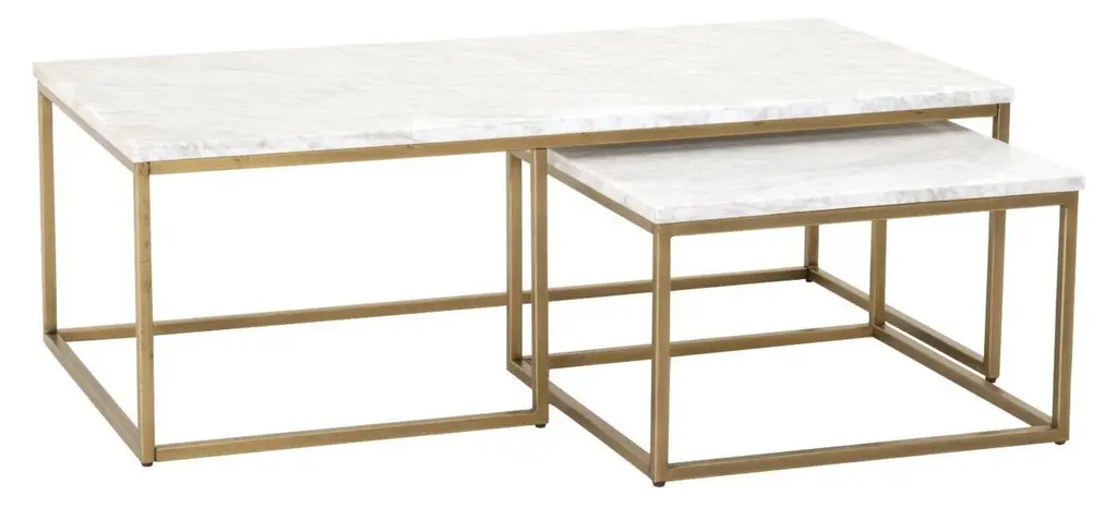 Adding two surfaces for stacking home accessories, this graceful nesting coffee table showcases an open steel base in brushed gold and a marble veneer top.