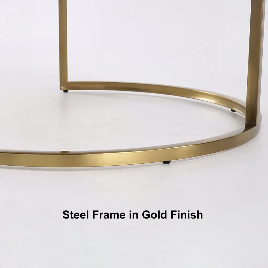 This elegant 2-piece nesting set features a natural-textured sintered stone top in a warm beige hue, complemented by a sleek gold steel frame. The smaller table nests neatly under the larger one for space efficiency, or can be separated to create ample surface area. With a convenient drawer for hidden storage, this set combines smart functionality with modern minimalist style.