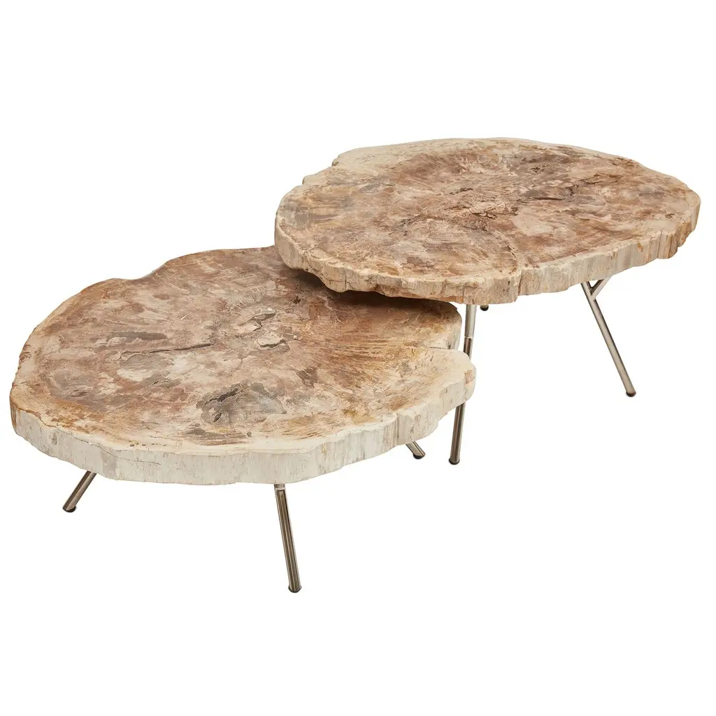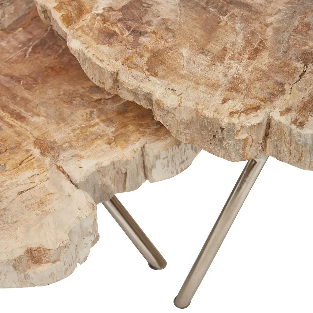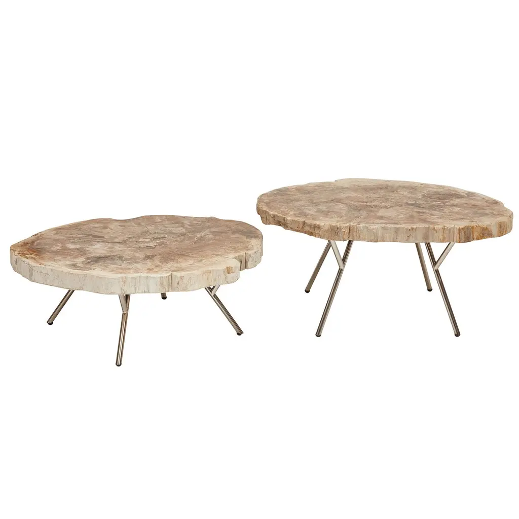 These beautiful petrified wood nesting tables feature a unique, organic shape. Available in various petrified wood finishes, Lastra is finished with a smooth, polished top and preserved raw edge. The tables sit upon sturdy yet minimal polished stainless steel legs.