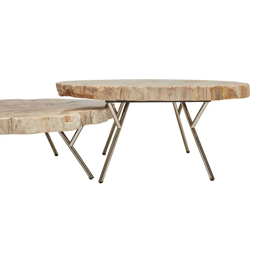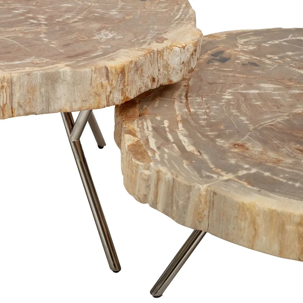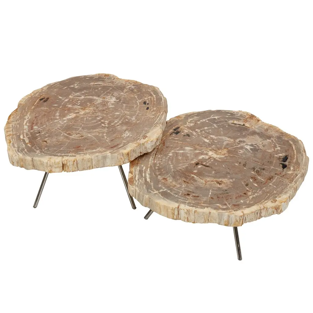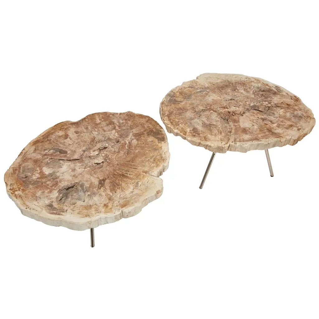 These beautiful petrified wood nesting tables feature a unique, organic shape. Available in various petrified wood finishes, Lastra is finished with a smooth, polished top and preserved raw edge. The tables sit upon sturdy yet minimal polished stainless steel legs.