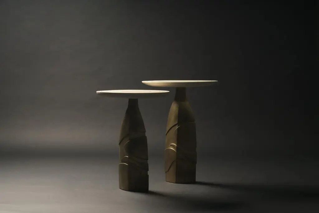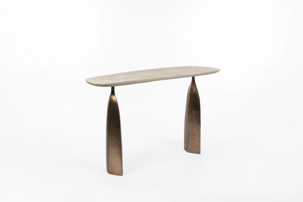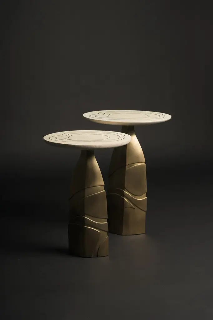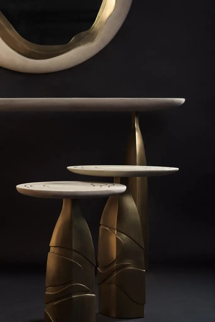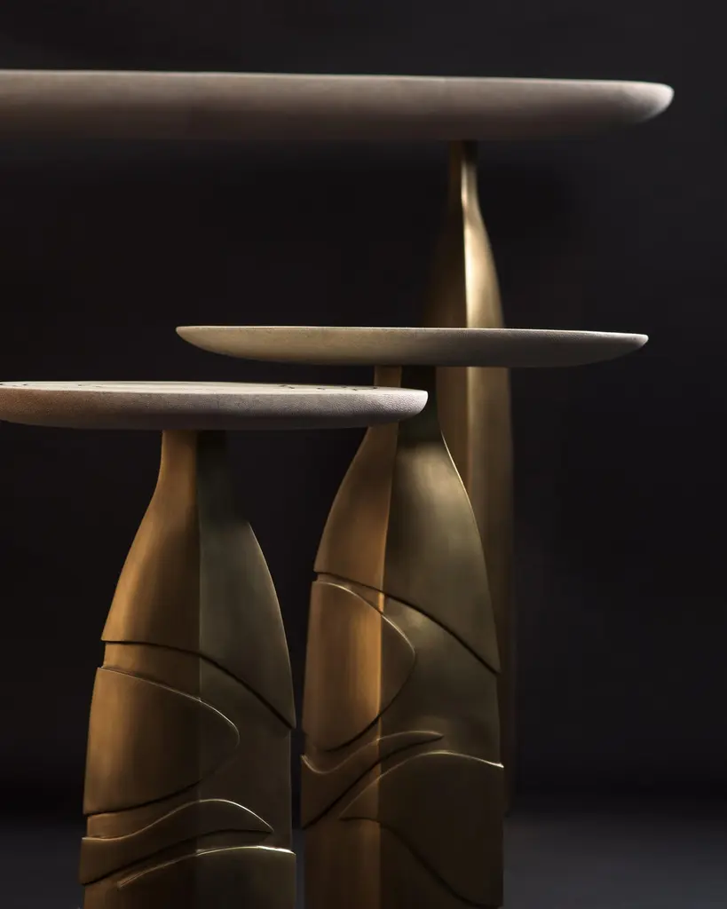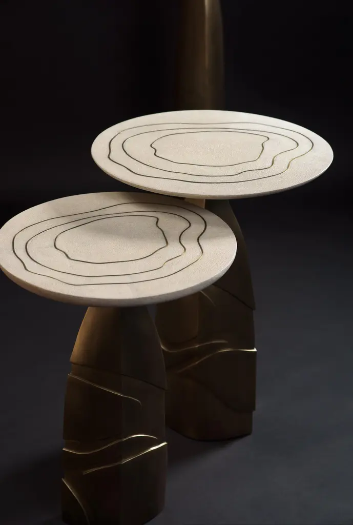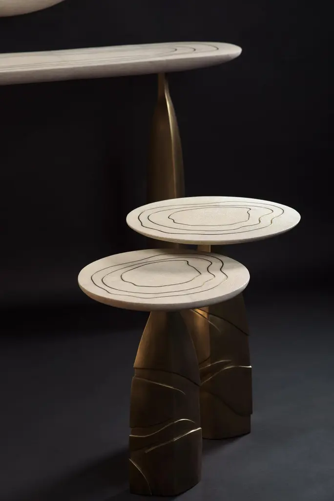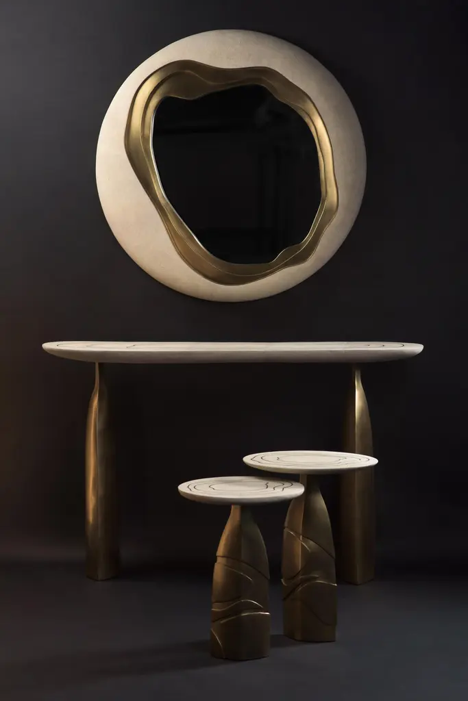 The Listeners by Patrick Coard Paris is a capsule collection of furniture pieces that are an ode and reflection to one of the artists most personal sculptures. The artist was inspired by the idea of resonance; what that means and how it can be felt. He embodied this concept of powerful energy echoing through the organic contours and amorphous shapes that are carried throughout the collection; the layers can be seen morphing into one another finding each their own unique expressions. These pieces whether placed together or placed separate truly bring to life a balance between art and design.Breakdown of the Listeners:The Listener Nesting Table I & II; these organic accent pieces with his signature amorphous pattern hand carved in relief on the bronze patina base. The tops draw closely into his inspiration for this collection , with the contoured metal lines inset within the cream shagreen inlay "vibrating" like music notes. The dimensions of this piece are 45 x 45 x 60 cm / 40 x 40 x 55 cmThe Listener Console Table; an organic statement piece with his signature sculptural detailing as seen on the pair of bronze patina brass legs. The amorphous shaped top draws closely into his inspiration for this collection , with the contoured metal lines inset within the cream shagreen inlay "vibrating" like music notes.The dimensions of this piece are 150 x 43 x 90 cmThis listing is for the Listener Mirror; an organic shaped wall piece emphasising the thematic of resonance and contours in this collection with the bronze patina brass layers morphing into the cream shagreen frame. The dimensions of this piece are 110 x 110 x 9.2 cmPatrick Coard Paris - an Irish/Scandinavian designer, first threw the gauntlet down with an awe inspiring collection of candles never seen before. Whilst the market has been saturated with scented candles he went back to basics of non-scented candles. He used his love of this aesthetic to be the first to bring out a collection of candles in shagreen and exotic skin textures, in beautifully hand carved patterns and sculptural shapes with metal inserts. His inspirations from sculptors from the 1930s and 1940s has created a modern collection in which one can utterly relax. From this he continued to explore his artistry by developing limited edition sculptures; ranging in jaw dropping sizes and shapes. His use of metal and his ability to manipulate and transform these materials into incredible organic forms exemplify his outstanding craftsmanship as a visionary artist. He continues to demonstrate his versatility by expanding into design, with capsule furniture collections that embody his limitless creativity with functionality.The Paris based label has distinguished themselves since their launch, with their iconic use of shagreen mixed with brass and other exotic materials. All furniture is handcrafted by skilled artisans, ultimately making each piece unique, designed in Paris and produced in the Philippines.All Patrick Coard Paris pieces are handmade by artisans, ultimately making each piece unique. Wipe clean with soft dry cloth.Color variants may occur, but this showcases the Parisian label's commitment to creating authentic luxurious products using natural components.