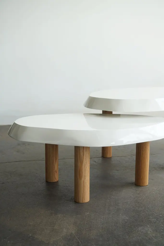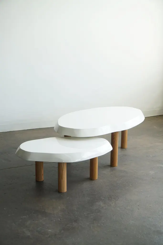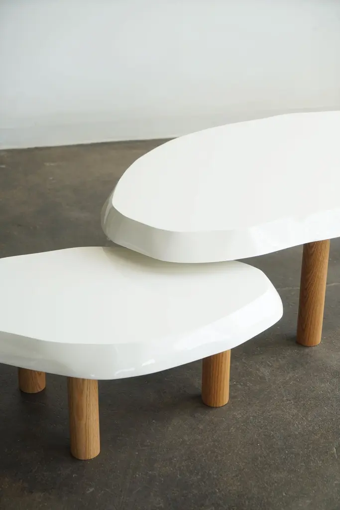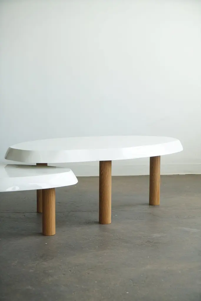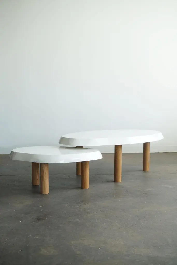 Organic shaped coffee table by Last Workshop, 2023 Hand shaped tops are made from solid wood.Solid oak legs, natural finish. Dimensions:Table one: 53"L x 32" x 19"HTable two: 36" x 24" x 15"HOak legs are removable. IN STOCK: 0If not in stock, current production: 8-9 weeks Customers can also choose from: Wood species, finishes, and overall dimensions. . Dimensions shown: -53”L x 32”W x 19”H-36"L x 24"W x 15"HFinish shown:White Lacquer, gloss finish. Natural oak legs.