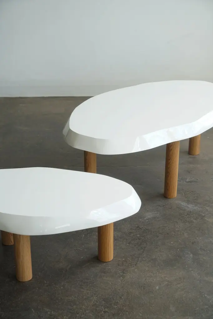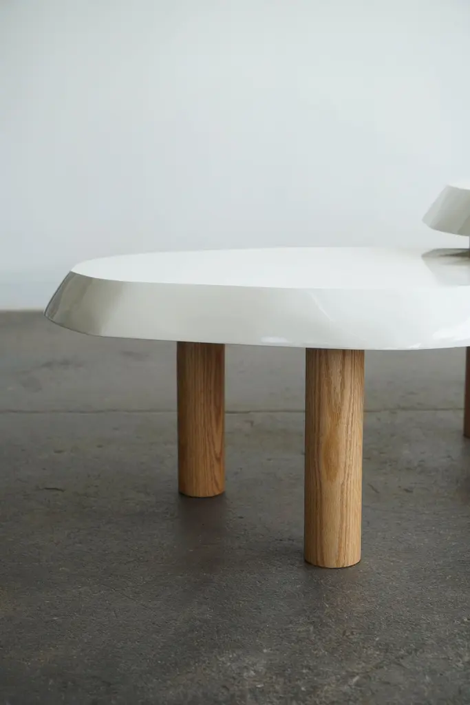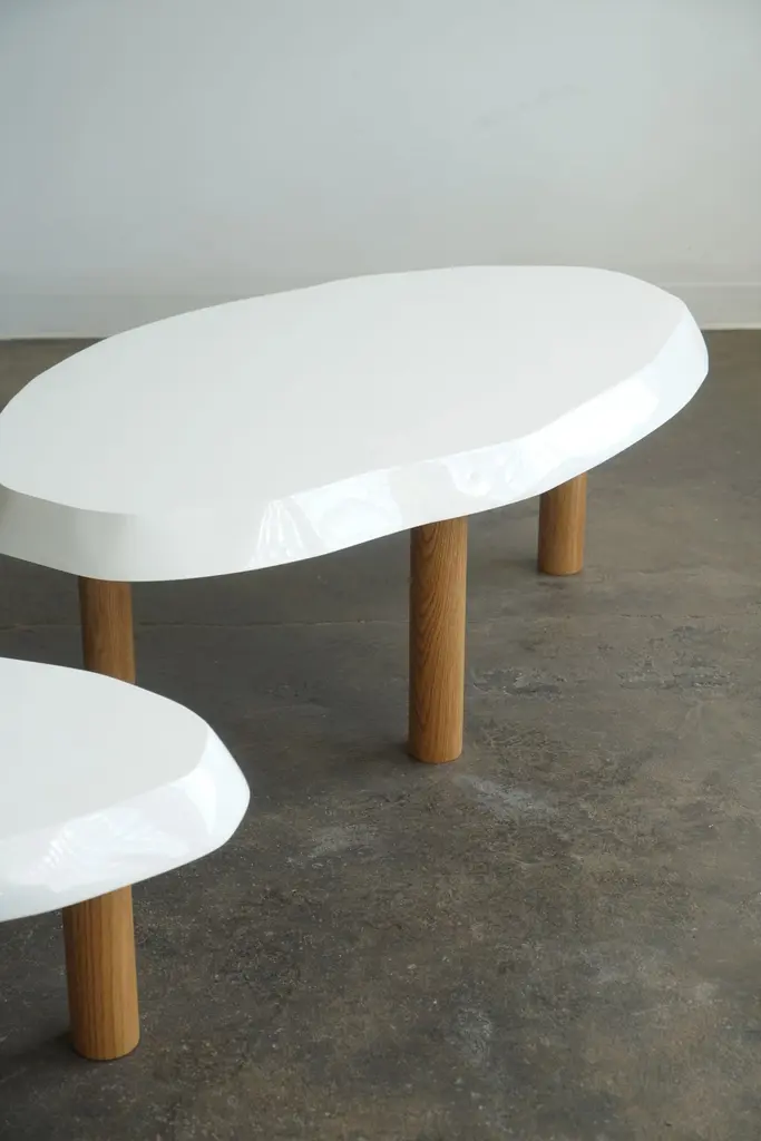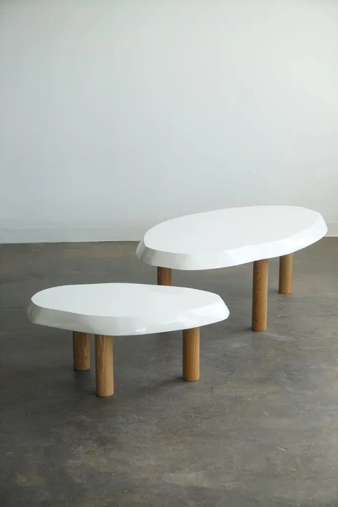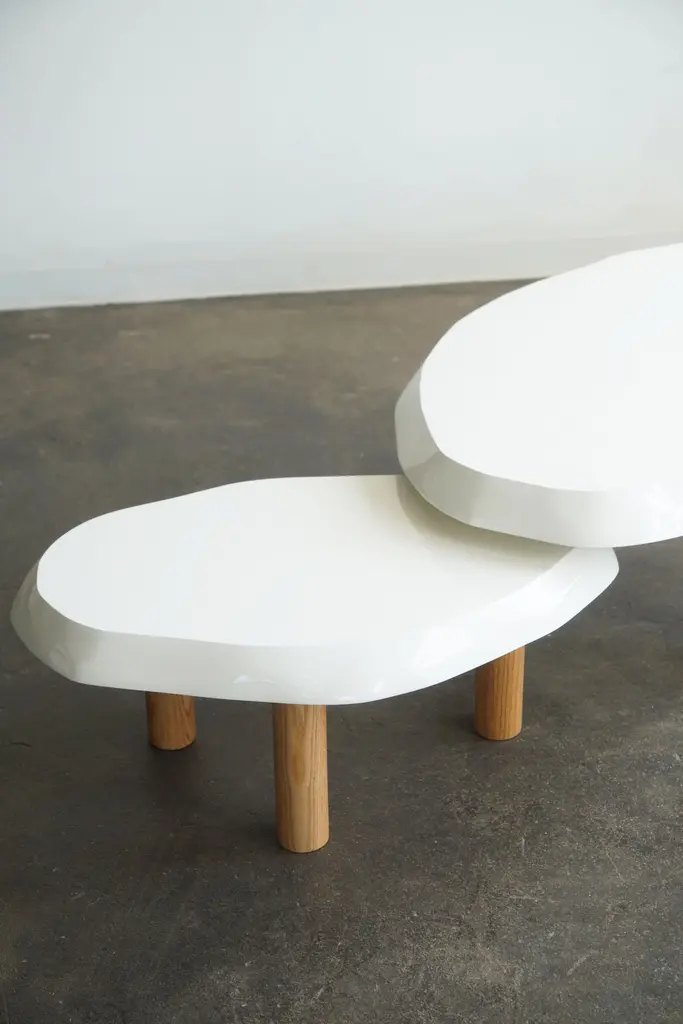 Organic shaped coffee table by Last Workshop, 2023 Hand shaped tops are made from solid wood.Solid oak legs, natural finish. Dimensions:Table one: 53"L x 32" x 19"HTable two: 36" x 24" x 15"HOak legs are removable. IN STOCK: 0If not in stock, current production: 8-9 weeks Customers can also choose from: Wood species, finishes, and overall dimensions. . Dimensions shown: -53”L x 32”W x 19”H-36"L x 24"W x 15"HFinish shown:White Lacquer, gloss finish. Natural oak legs.