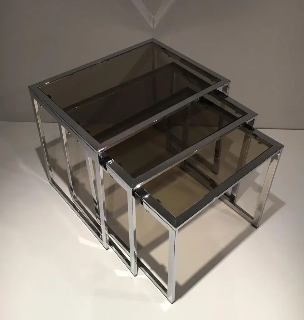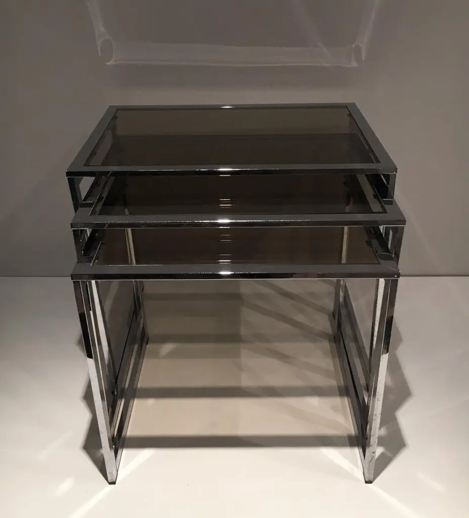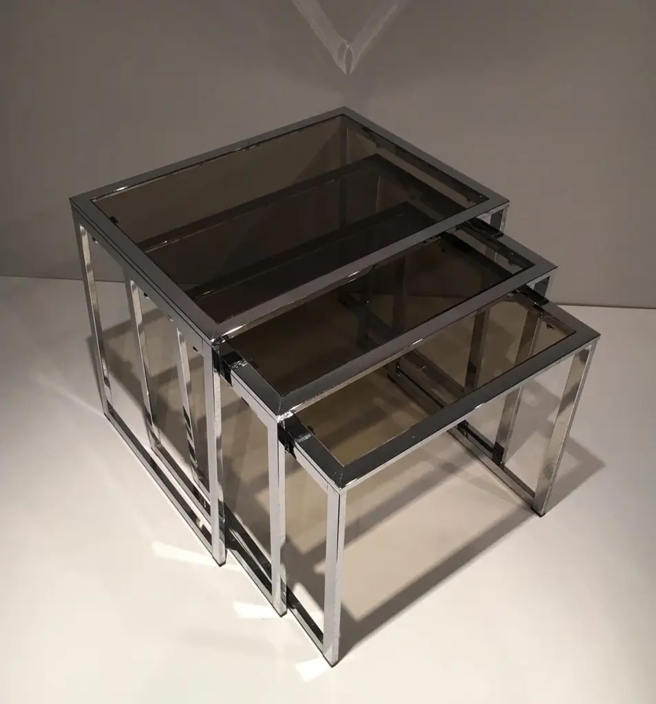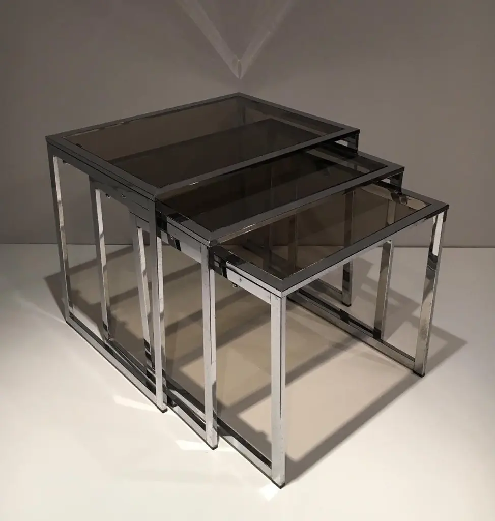 Set Of 3 Chromed Nesting Tables With Smoked Glass Shelves, French Work, Circa 19