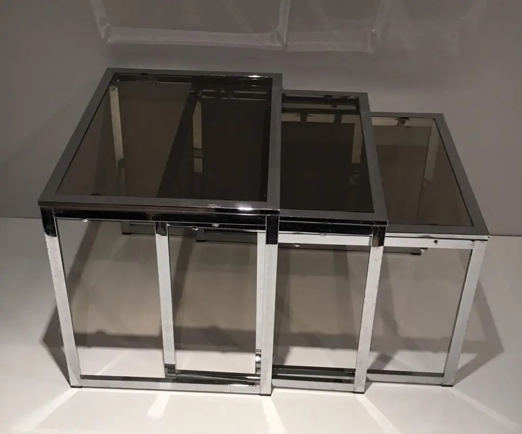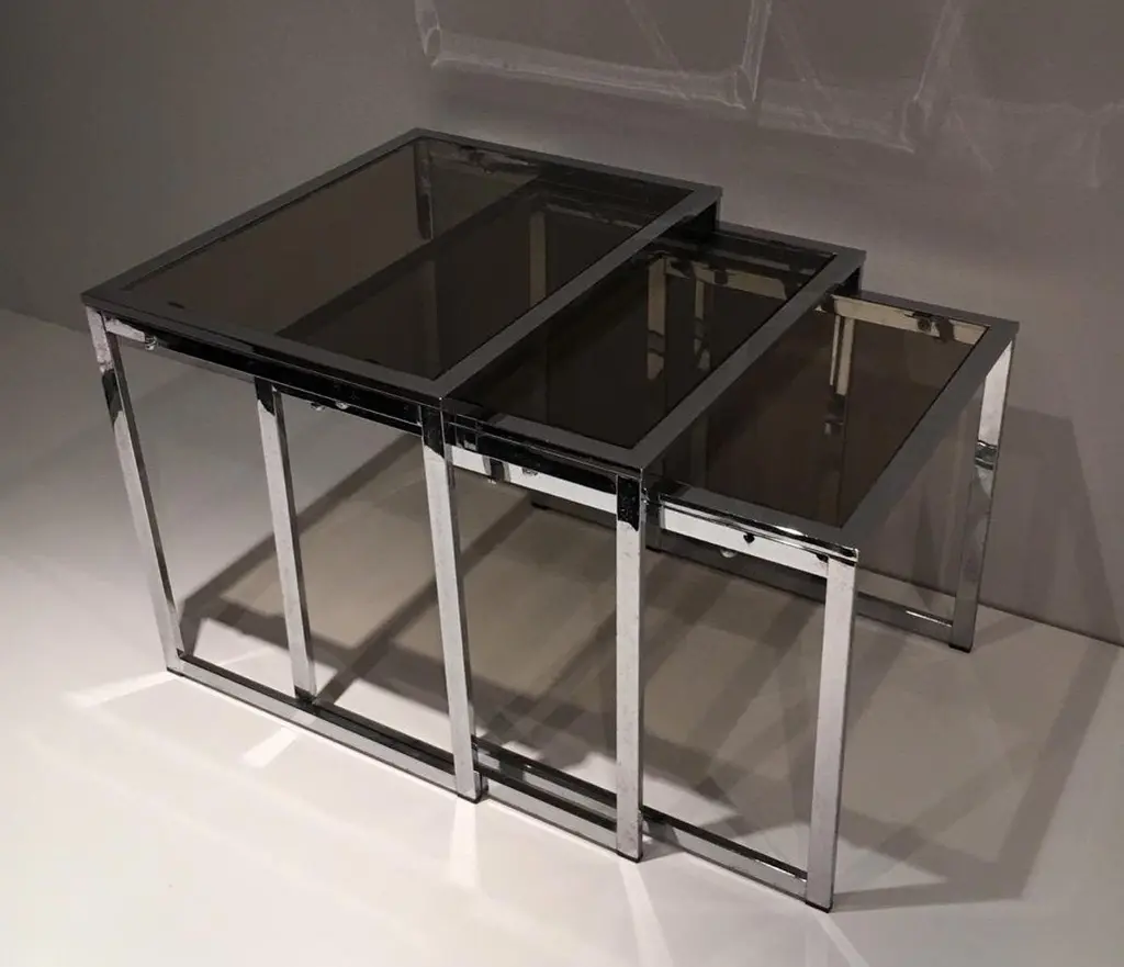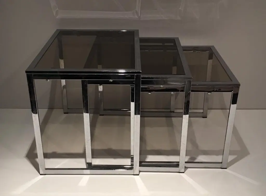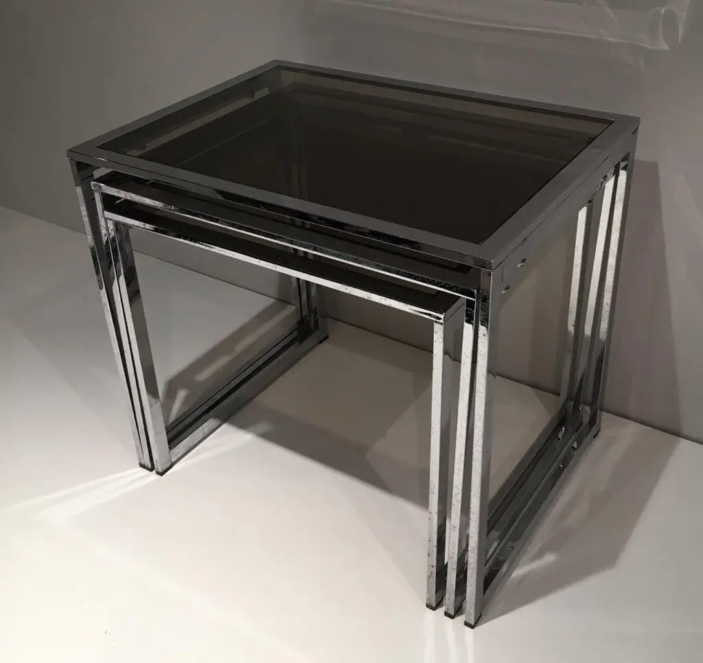 Set Of 3 Chromed Nesting Tables With Smoked Glass Shelves, French Work, Circa 19