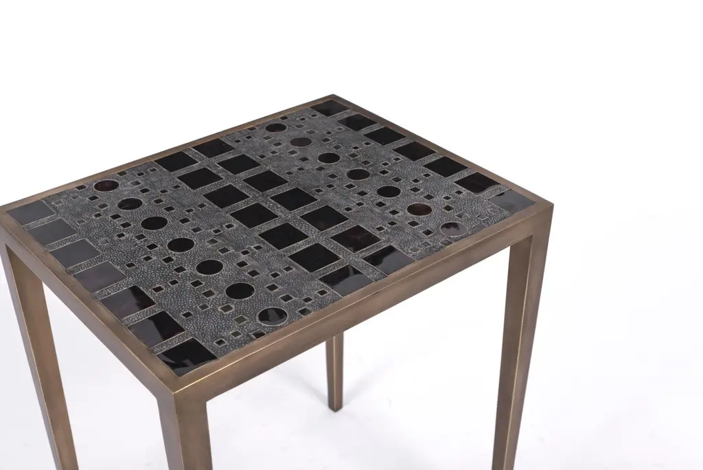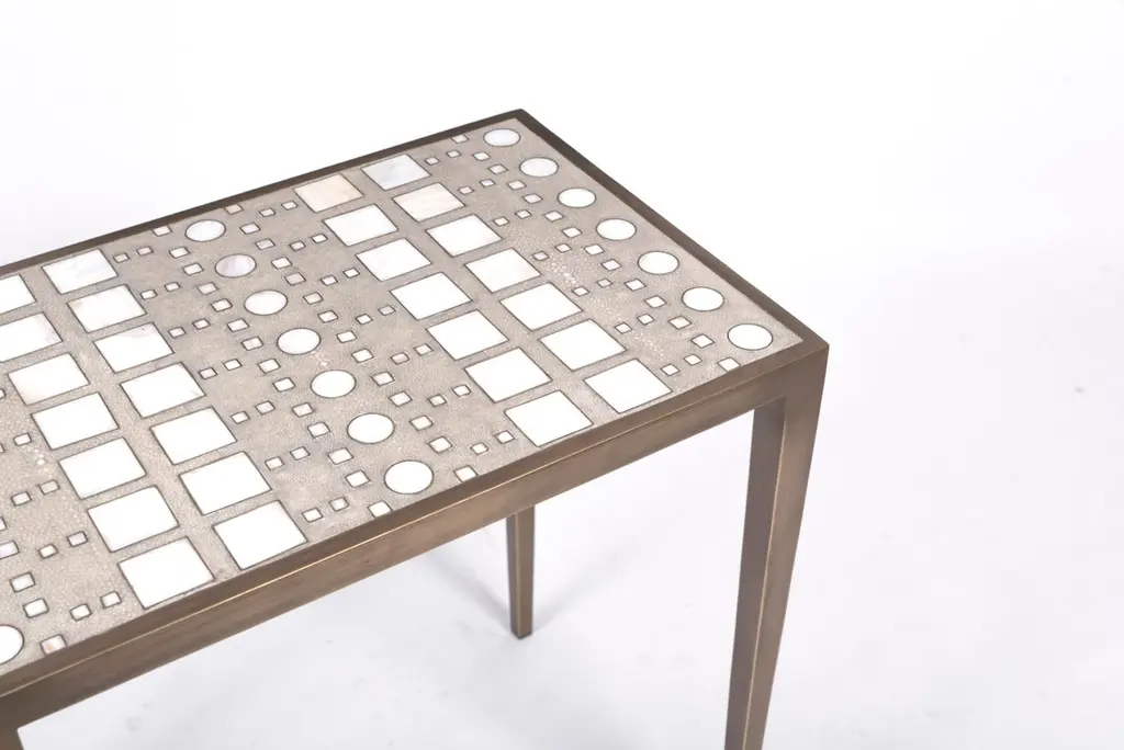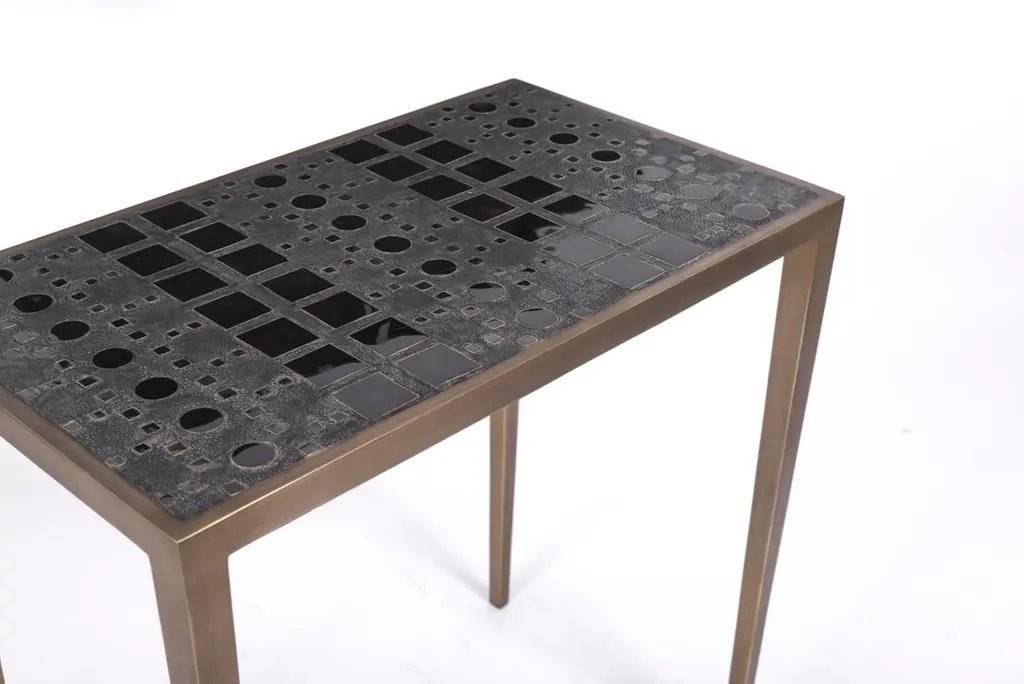The Paris based label has distinguished themselves since their launch, with their iconic use of shagreen mixed with brass and other exotic materials. All furniture is handcrafted by skilled artisans, ultimately making each piece unique, designed in Paris and produced in the Philippines.The set of 3 Klimt nesting tables in a mixture of cream/coal black shagreen, black shell, mother of pearl & bronze-patina brass are a fun set to create elegant and geometric shapes. This piece demonstrates the incredible craftsmanship of Augousti artisans, with the mixture of materials to create this hand inlaid graphic pattern. This piece comes in 3 sizes total to nest (L, M & S), image at end of slide. The option to purchase the tables as individuals is available upon request. Available in other finishes, image at end of slide.The dimensions of this set are 44 x 35 x 53 cm / 17.25 x 14 x 20.75", 52 x 35 x 57 cm / 20.5 x 13.75 x 19.75", 60 x 35 x 60 cm / 23.5 x 13.75 x 23.5"All R&Y Augousti pieces are handmade by artisans, ultimately making each piece unique. Custom color or sizing available on request. Wipe clean with soft dry cloth.Acclaimed design duo Ria & Yiouri Augousti have established themselves since the 1990s as pioneers of modern-vintage style through their luxurious Art Deco inspired collections.The Paris based label has distinguished themselves since their launch, with their iconic use of shagreen mixed with brass and other exotic materials. All furniture is handcrafted by skilled artisans, ultimately making each piece unique. All shagreen-covered items should be kept out of direct sunlight, color variants may occur on the stingray and other exotic finishes, but this showcases the Parisian label's commitment to creating authentic luxurious products using natural components.