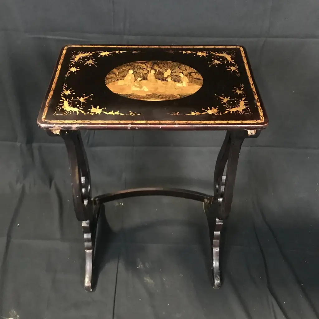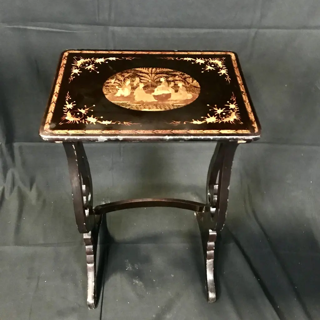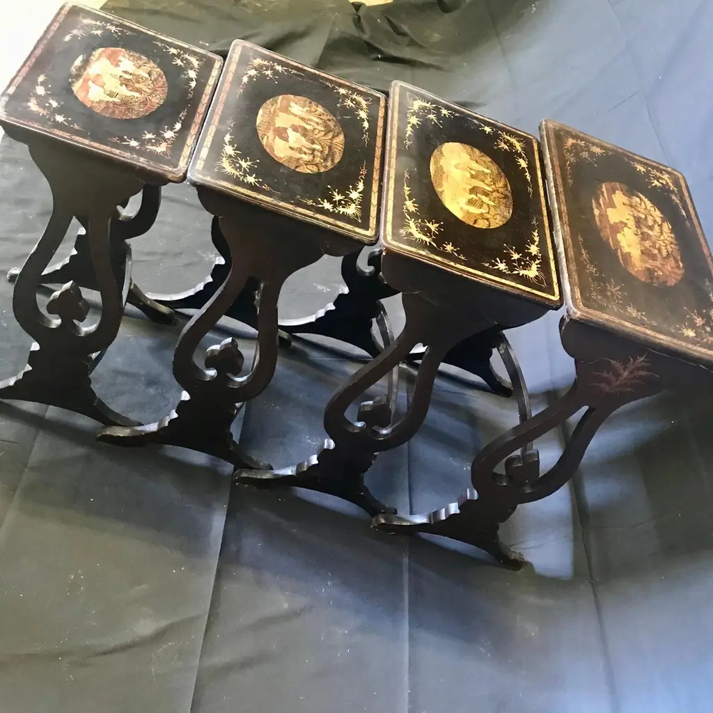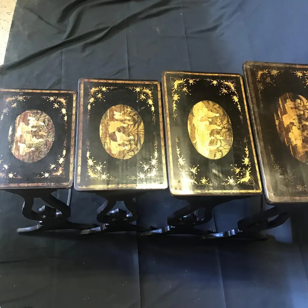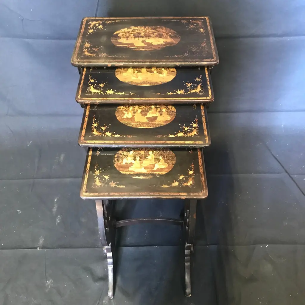 Set Of Four Japanned French Chinoiserie Style Hand Painted Nesting Tables