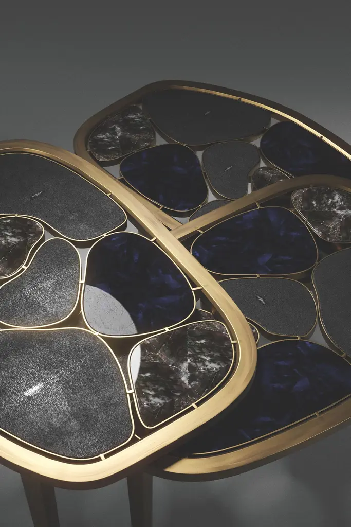 The Paris based label has distinguished themselves since their launch, with their iconic use of shagreen mixed with brass and other exotic materials. All furniture is handcrafted by skilled artisans, ultimately making each piece unique, designed in Paris and created in the Philippines.The Small Atlas Nesting Coffee Table by Kifu Paris is a whimsical and geometric piece inspired by Earth's organic tectonic plates constantly moving to form and create new shapes. The organic parts, interconnected by bronze-patina brass links, are inlaid in mixture of cream shagreen, onyx and smokey white quartz. The frame and legs are also in bronze-patina brass. This listing is to purchase all only the small size, the other size tables are available to purchase on separate listings and as a set. This piece is designed by Kifu Augousti the daughter of Ria and Yiouri Augousti. The dimensions of this piece are:Small Atlas Nesting Coffee Table53 x 36.5 x 34 cmThe others measure:Medium Atlas Nesting Coffee Table60 x 41.5 x 37 cmLarge Atlas Nesting Coffee Table70 x 49 x 40 cmThe finish of the shagreen is authentic as it is hand-dyed and the designer calls the finish look: "antique natural shagreen."All Kifu Paris pieces are handmade by artisans, ultimately making each piece unique.Custom color/sizing available on request.Wipe clean with soft dry cloth.Although inspired by her parents, her collection of Home Accessories and Furniture is a distinct identity of its own. Kifu uses handmade techniques of elaborate inlay patterns of shagreen, shells, semi-precious stones, materials she experienced as a child growing up in her parent’s studio, but interpreted in a younger quirkier way reflecting her youth. From her "jewelry inspired knobs" on decorative boxes, gold bar boxes and an extravagant inlay pattern mix of shagreen and shell inspired by galactic constellations, as seen on her enormous round mirror, is refreshing to see. Kifu embodies whimsical elements throughout her collection and is not afraid to be daring and unexpected in her approach to design.All shagreen-covered items should be kept out of direct sunlight, color variants may occur on the stingray and other exotic finishes, but this showcases the Parisian label's commitment to creating authentic luxurious products using natural components.