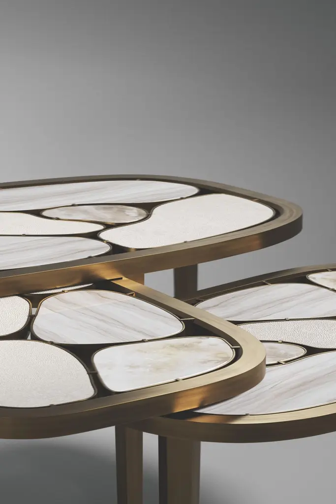 The Paris based label has distinguished themselves since their launch, with their iconic use of shagreen mixed with brass and other exotic materials. All furniture is handcrafted by skilled artisans, ultimately making each piece unique, designed in Paris and created in the Philippines.The Small Atlas Nesting Coffee Tables by Kifu Paris is a whimsical and geometric piece inspired by Earth's organic tectonic plates constantly moving to form and create new shapes. The organic parts, interconnected by bronze-patina brass links, are inlaid in mixture of cream shagreen, onyx and smokey white quartz. The frame and legs are also in bronze-patina brass. This listing is to purchase the small size, the other size tables are available to purchase on separate listings as well as a set. This piece is designed by Kifu Augousti the daughter of Ria and Yiouri Augousti. Large Atlas Nesting Coffee Table70 x 49 x 40 cmMedium Atlas Nesting Coffee Table60 x 41.5 x 37 cmSmall Atlas Nesting Coffee Table53 x 36.5 x 34 cmThe finish of the shagreen is authentic as it is hand-dyed and the designer calls the finish look: "antique natural shagreen."All Kifu Paris pieces are handmade by artisans, ultimately making each piece unique.Custom color/sizing available on request.Wipe clean with soft dry cloth.Although inspired by her parents, her collection of Home Accessories and Furniture is a distinct identity of its own. Kifu uses handmade techniques of elaborate inlay patterns of shagreen, shells, semi-precious stones, materials she experienced as a child growing up in her parent’s studio, but interpreted in a younger quirkier way reflecting her youth. From her "jewelry inspired knobs" on decorative boxes, gold bar boxes and an extravagant inlay pattern mix of shagreen and shell inspired by galactic constellations, as seen on her enormous round mirror, is refreshing to see. Kifu embodies whimsical elements throughout her collection and is not afraid to be daring and unexpected in her approach to design.All shagreen-covered items should be kept out of direct sunlight, color variants may occur on the stingray and other exotic finishes, but this showcases the Parisian label's commitment to creating authentic luxurious products using natural components.