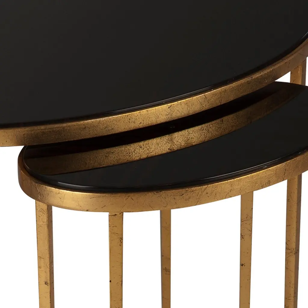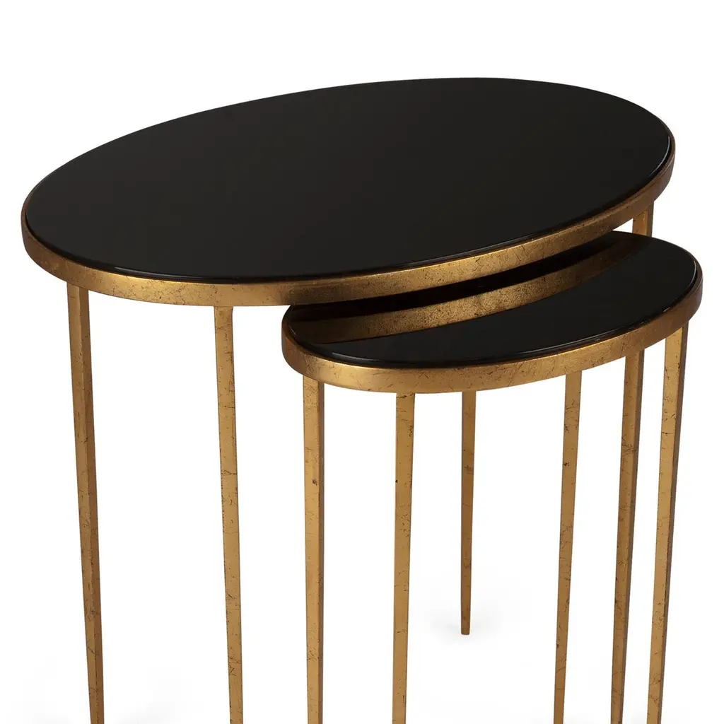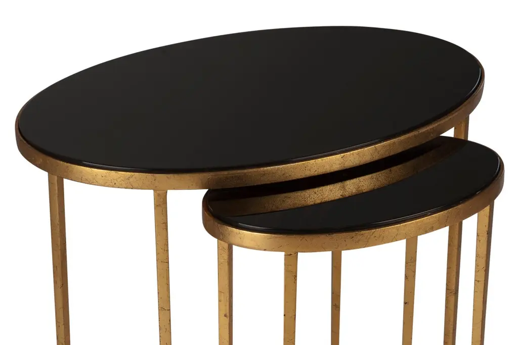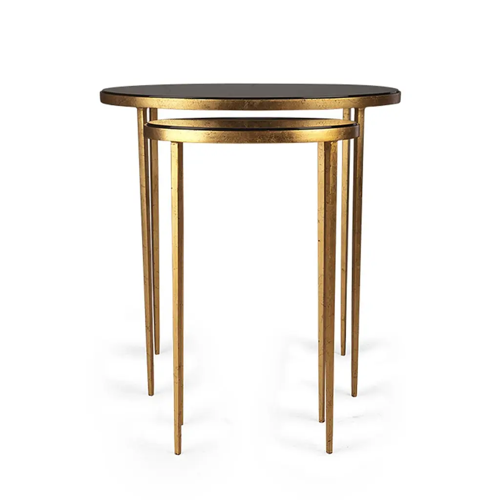 Nesting table St Louis set of 2 with structure inforged iron painted in antique gold finish. Withveneered ebony top.