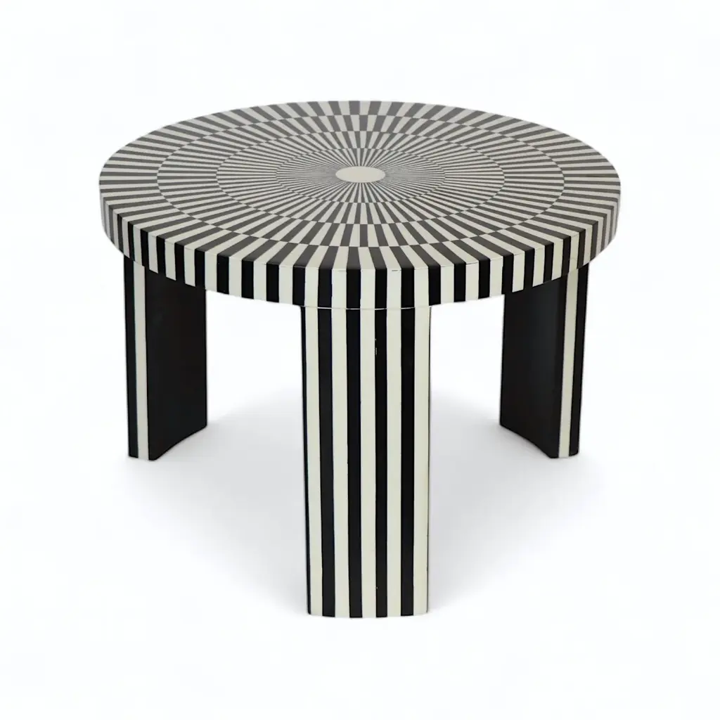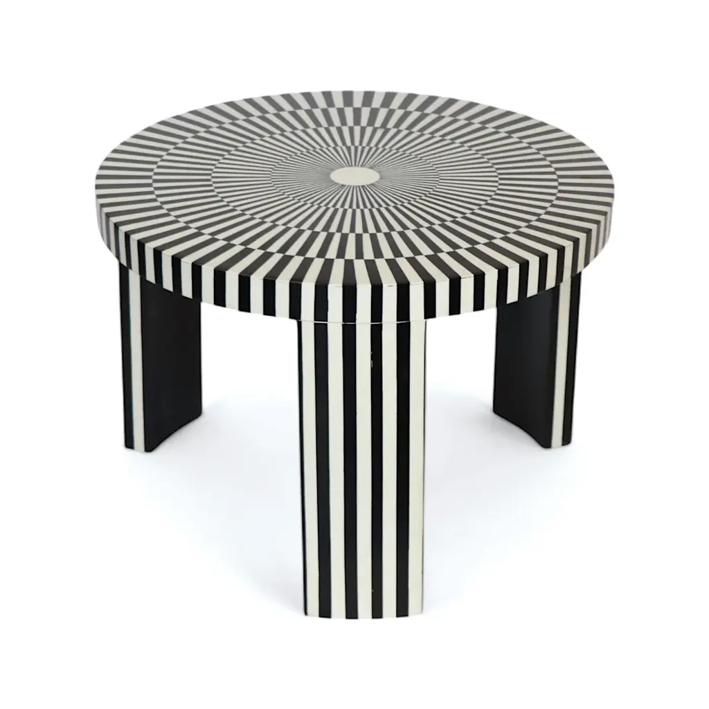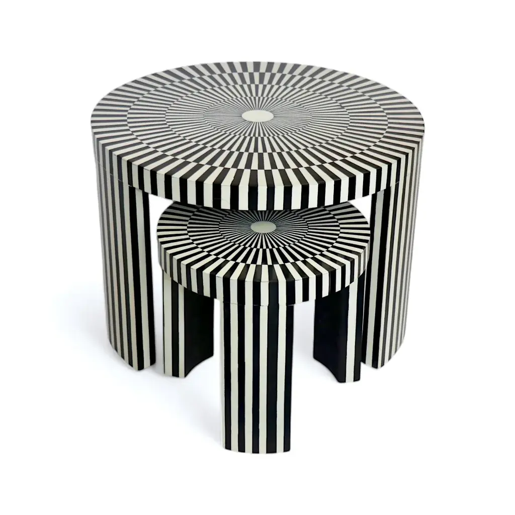 Elevate your space with this exquisite black and white bone inlay table set, featuring a stunning striped design that exudes elegance and sophistication. The set includes a larger round table and a perfectly matching nested piece, ideal for versatile use as a coffee table, side table, or accent piece. Handcrafted by skilled artisans, this set is a perfect blend of luxury and functionality, offering timeless beauty and a contemporary edge. Sizes: Large: 20" x 18.5" H Small: 16" x 16.5" H Stripped Pattern Bone Inlay Nesting Coffee Table Details: • Material: Hand-carved bone inlay with resin and a sturdy wooden base. • Design: Bold black-and-white striped pattern with a captivating radial motif on the tabletop. • Functionality: Two-piece nesting design for versatile use and easy storage. • Craftsmanship: Handcrafted by artisans, ensuring each piece is one of a kind. Care and Maintenance: 1. Cleaning: Use a soft, dry cloth to dust regularly. Avoid abrasive cleaners or chemicals to preserve the inlay's finish. 2. Protection: Keep away from direct sunlight and moisture to prevent discoloration or damage. 3. Use: Place coasters under items to avoid scratches or staining.