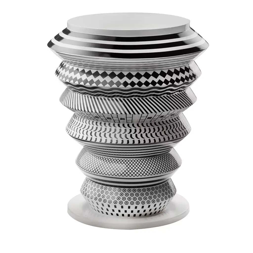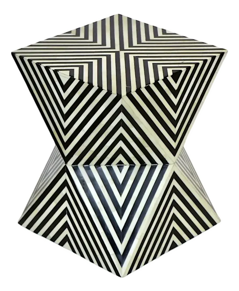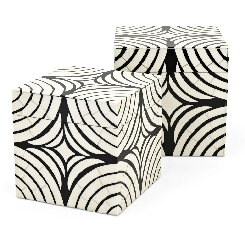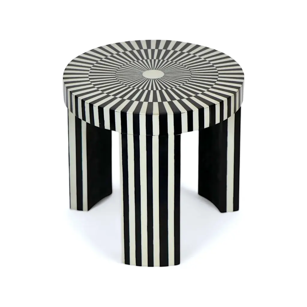 Elevate your space with this exquisite black and white bone inlay table set, featuring a stunning striped design that exudes elegance and sophistication. The set includes a larger round table and a perfectly matching nested piece, ideal for versatile use as a coffee table, side table, or accent piece. Handcrafted by skilled artisans, this set is a perfect blend of luxury and functionality, offering timeless beauty and a contemporary edge. Sizes: Large: 20" x 18.5" H Small: 16" x 16.5" H Stripped Pattern Bone Inlay Nesting Coffee Table Details: • Material: Hand-carved bone inlay with resin and a sturdy wooden base. • Design: Bold black-and-white striped pattern with a captivating radial motif on the tabletop. • Functionality: Two-piece nesting design for versatile use and easy storage. • Craftsmanship: Handcrafted by artisans, ensuring each piece is one of a kind. Care and Maintenance: 1. Cleaning: Use a soft, dry cloth to dust regularly. Avoid abrasive cleaners or chemicals to preserve the inlay's finish. 2. Protection: Keep away from direct sunlight and moisture to prevent discoloration or damage. 3. Use: Place coasters under items to avoid scratches or staining.