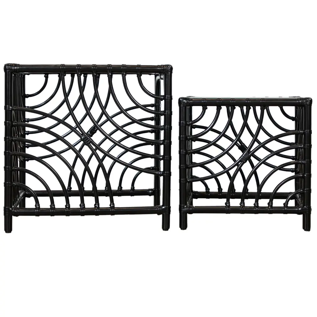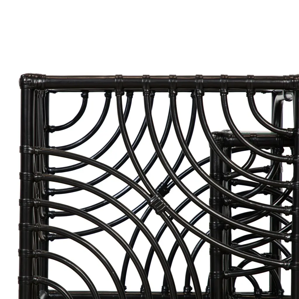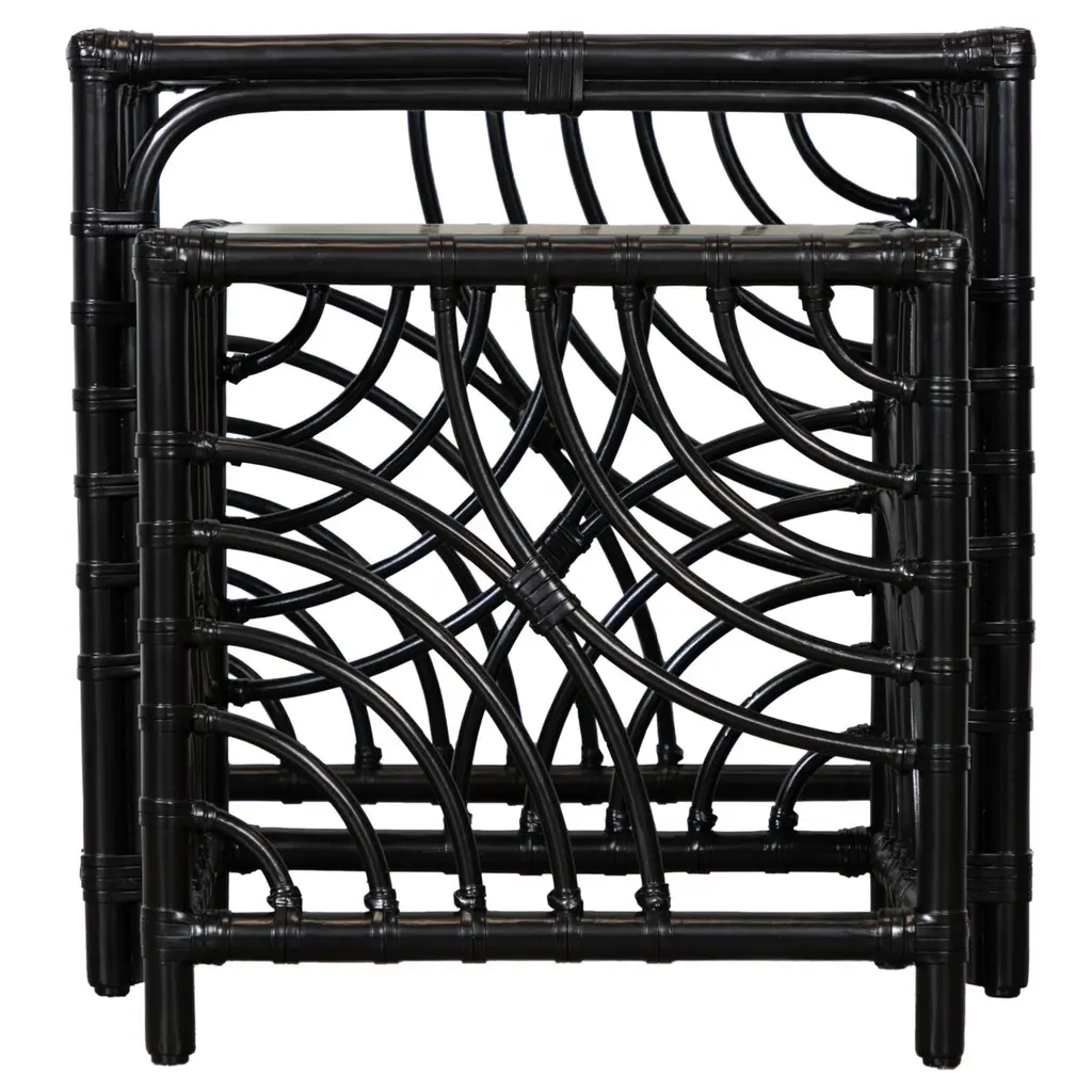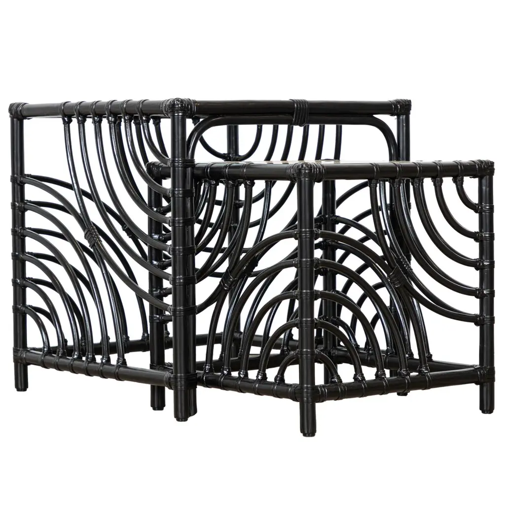 Showcasing hand-arched curves and a black finish, this set of nesting tables is masterfully crafted of rattan with rawhide bindings for added strength and textural contrast. Each top is inset with glass, offering a sleek and easy-to-clean surface for drinks and accents.