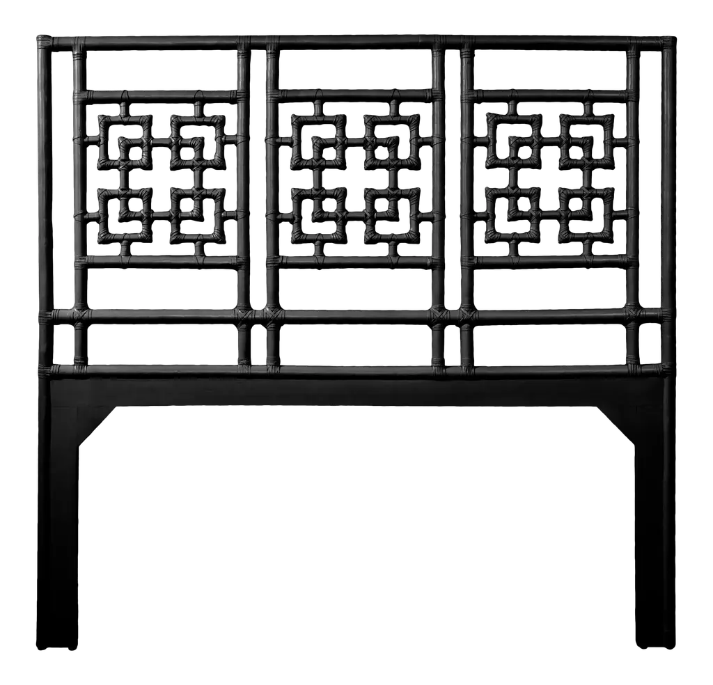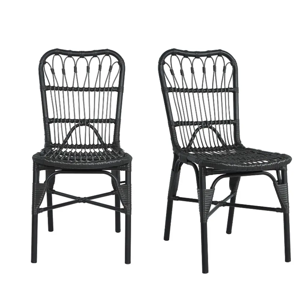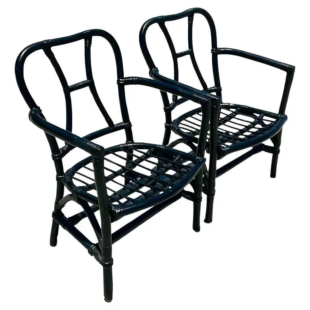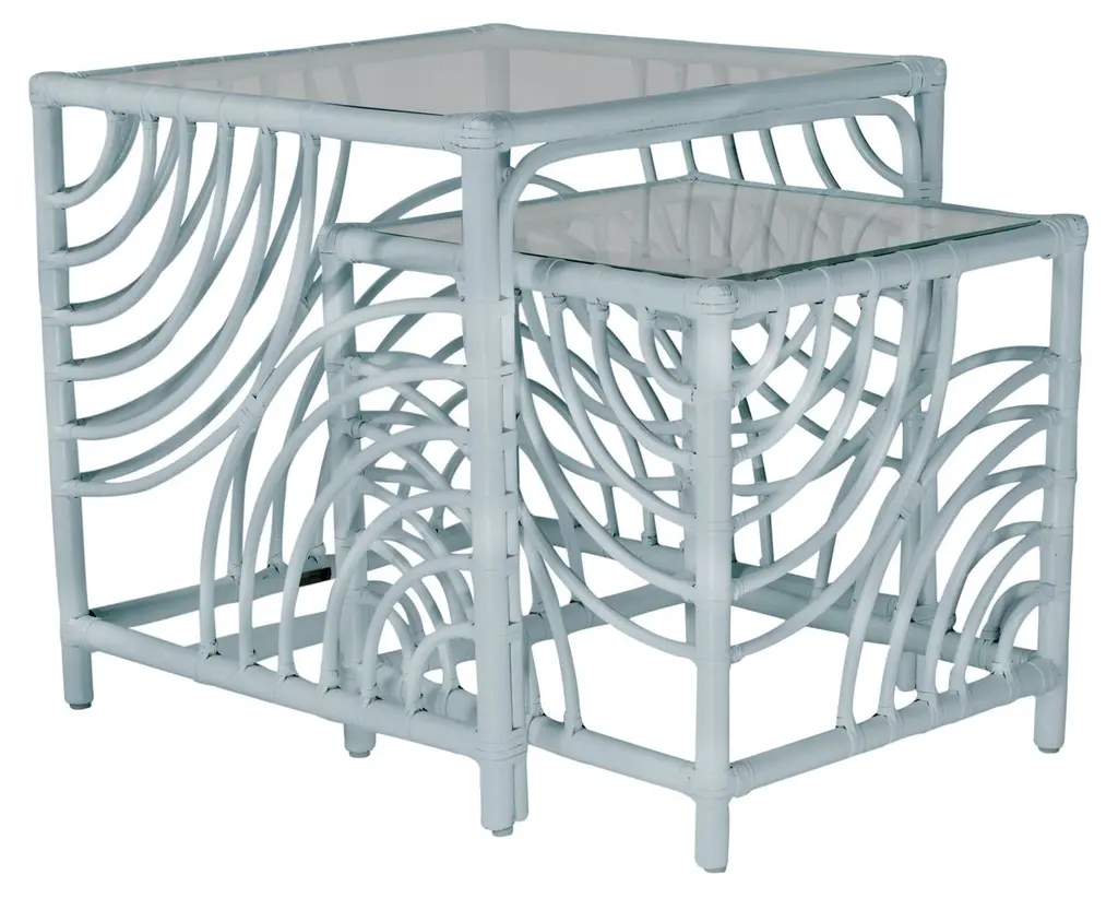 Showcasing hand-arched curves and a black finish, this set of nesting tables is masterfully crafted of rattan with rawhide bindings for added strength and textural contrast. Each top is inset with glass, offering a sleek and easy-to-clean surface for drinks and accents.