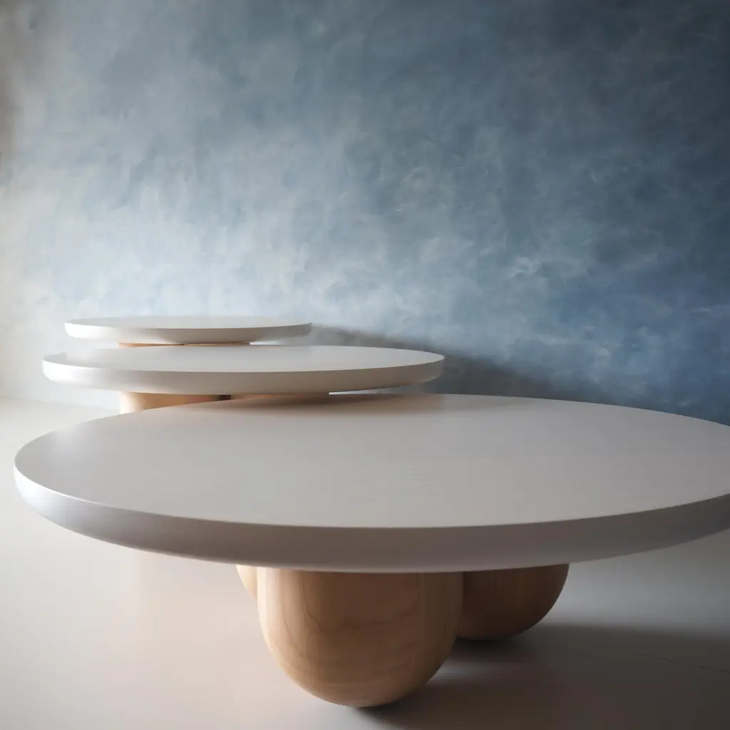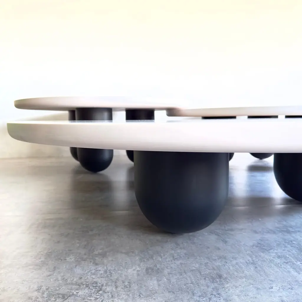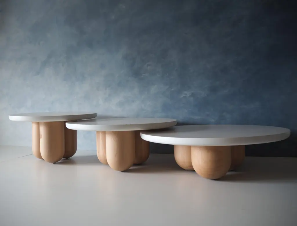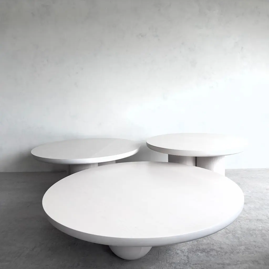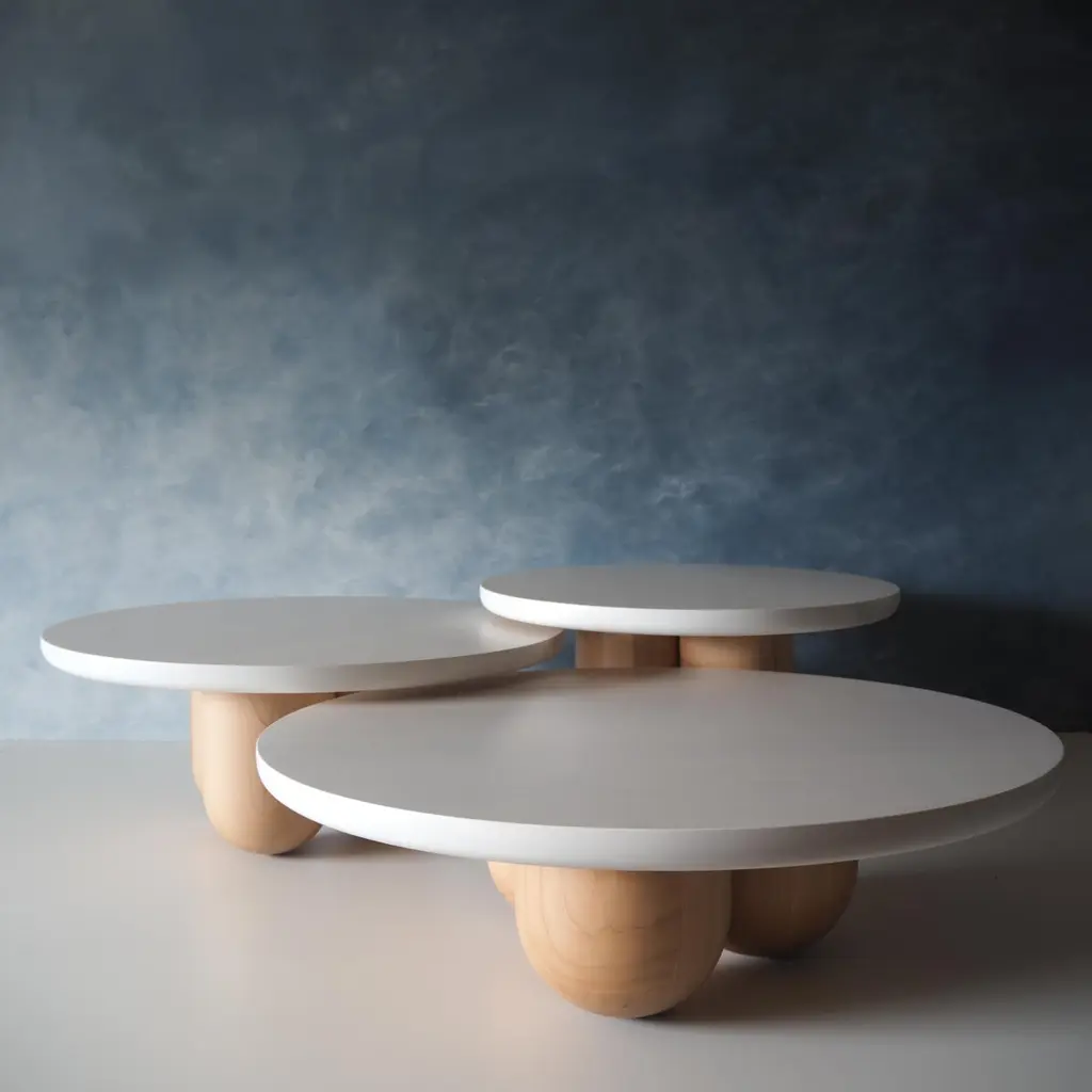 Our Tri-Nesting column tables are inspired by columns left behind by ancient Greek and Roman architecture. Fitting well in many interiors the tables whitened finish allows you to admire the wood grain below. These tables have a solid whitened maple top and can be ordered with matching whitened maple bases, clear coat maple bases, or blackened maple bases. Can be also be made in walnut or oak. You can order the tables with columns tight together or a little apart. These tables are freestanding and can be arranged in anyway that suits your space. The three tables are 39'' diameter by 12'' height, 35'' diameter by 14.25'' height, and 30'' diameter by 16.5'' height.The tables height, width, and base can be custom made to match your needs. Custom wood species and finish can also be ordered to match your space.Every purchase supports our local economy and provides living wages to North American craftspeople. As always, customizations are welcome!