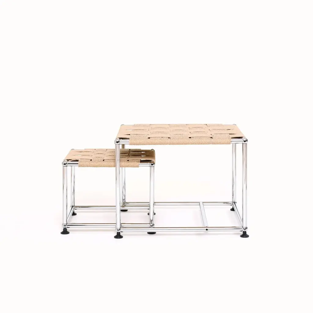 ExclusivesWS Nesting TablesWoven Structures CollectionA collaboration with New York-based industrial designer Henry Julier, Woven Structures is a collection of objects that integrates Danish paper cord into the USM Haller system for the first time, celebrating the interplay of contrasting materials that each hold a place of importance within the world of furniture design.DimensionsH 15.5in / 523mmW 20.5in / 813mmD 26.5in / 418mmWeight7.05 kgs / 15.52 lbsMaterialsThe USM Haller system is made of powder-coated steel panels and chromed steel frame. GREENGUARD and Cradle to Cradle Certified®.