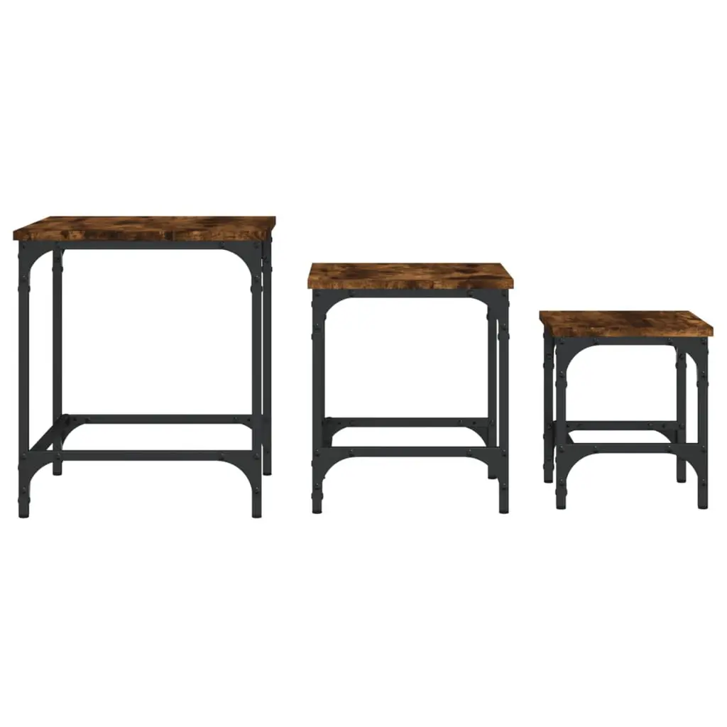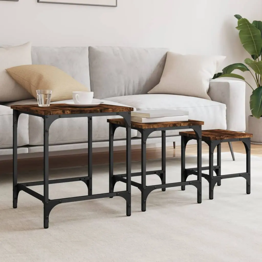 This 3-piece nesting coffee table set is a must-have for any living space, combining style and functionality. Crafted from high-quality engineered wood with a sleek smoked oak finish, these tables offer a flexible solution for modern decor. With their clean lines and industrial vibe, they fit seamlessly into any room, from the living room to the bedroom or even a chic entryway console. Space-Saving Design: These tables stack together easily, making them great for small rooms or multifunctional spaces. This keeps your area looking neat and tidy, perfect for city living.Robust Construction: Built with tough engineered wood and a solid matte black frame, these tables can handle daily use while looking great. They're perfect for indoors, as they won't easily tip or wear out over time.Modern Industrial Style: The mix of a sleek brown surface and matte black legs gives a cool vibe that matches both industrial and minimalist decor. They shine as focal pieces or nice accents in any room.Multiple Uses: Whether you're serving coffee, showing off plants, or using them as a chic side table, these nesting tables fit your needs. Their compact size allows for various setups that suit different occasions.Easy Maintenance: The smooth surface makes clean-up a breeze—just wipe it down with a damp cloth. This keeps them looking sharp and lasts longer in any home.