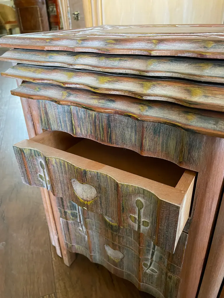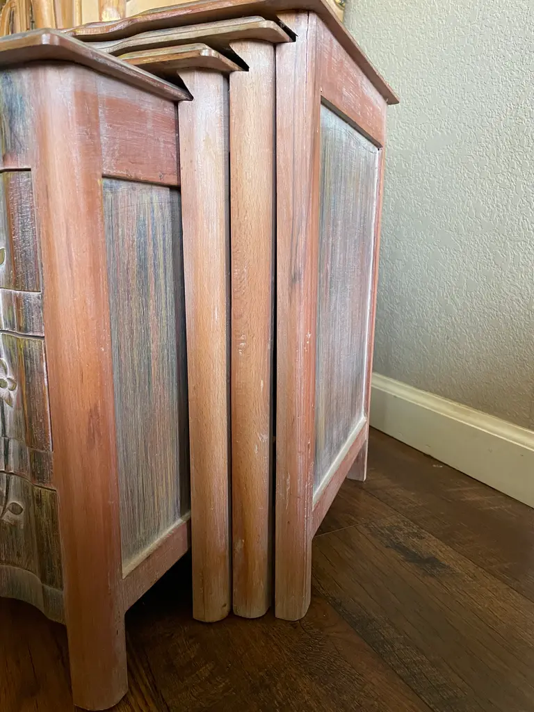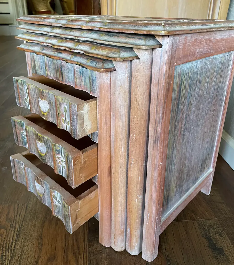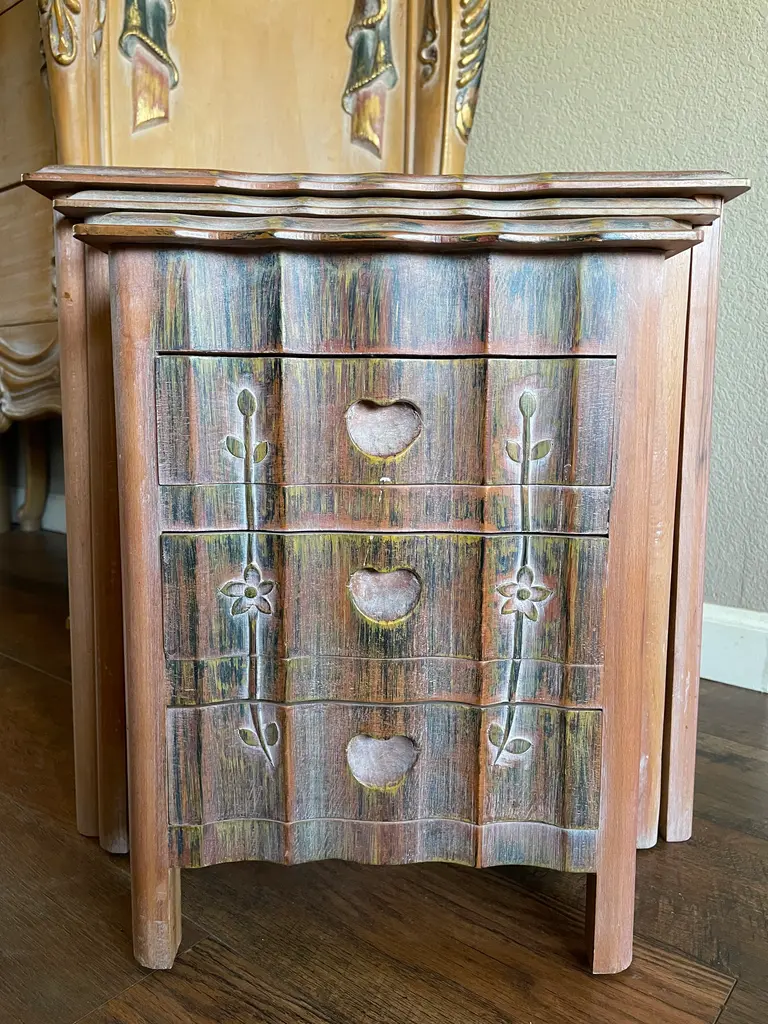 Charming set of nesting tables in a rustic finish with vibrant colored accents. Impeccably handcrafted with utmost attention to detail.