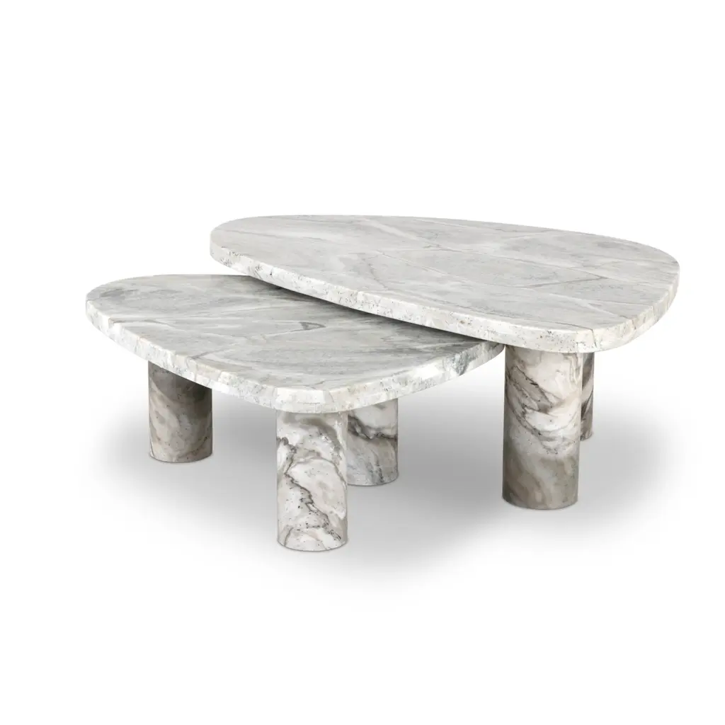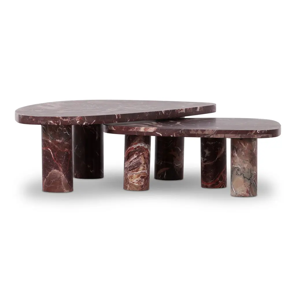 Experience the sheer luxury of the Zion Nesting Coffee Table Set from Four Hands. Crafted with natural marble, the tripod base, and intricate veining showcase its organic beauty. The rich merlot hue and smooth legs contrast the rugged organic textures within the stone. Perfect for nested placement, this set adds elegance and sophistication to any space. Highlights