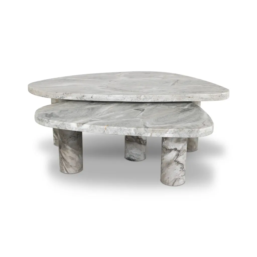 Experience the sheer luxury of the Zion Nesting Coffee Table Set from Four Hands. Crafted with natural marble, the tripod base, and intricate veining showcase its organic beauty. The rich merlot hue and smooth legs contrast the rugged organic textures within the stone. Perfect for nested placement, this set adds elegance and sophistication to any space. Highlights