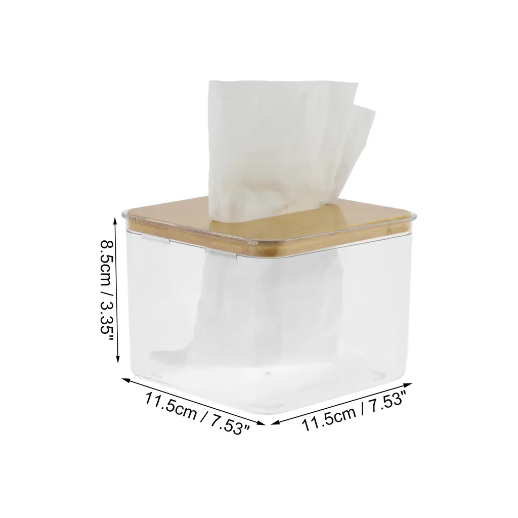 Features:This tissue box cover is designed in minimalist style, and made with good quality materials. A stylish home decoration accessory for your living room, bedroom nightstand, countertop, toilet, bathroom, laundry room, car and etc.Convenient to hide or replace broken and damage tissue boxes. Easy to store and refill new tissues.Please Note: Please allow 1-3mm measuring deviation due to manual measurement. Specifications: Product Name: Tissue BoxColor: ClearMaterial: PET, Bamboo Size: 11.5x11.5x8.5cm / 7.53"x7.53"x3.35"(L*W*H)Package List: 1 Pc Tissue Box
