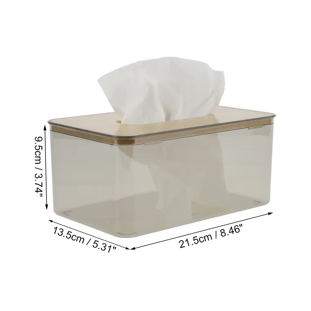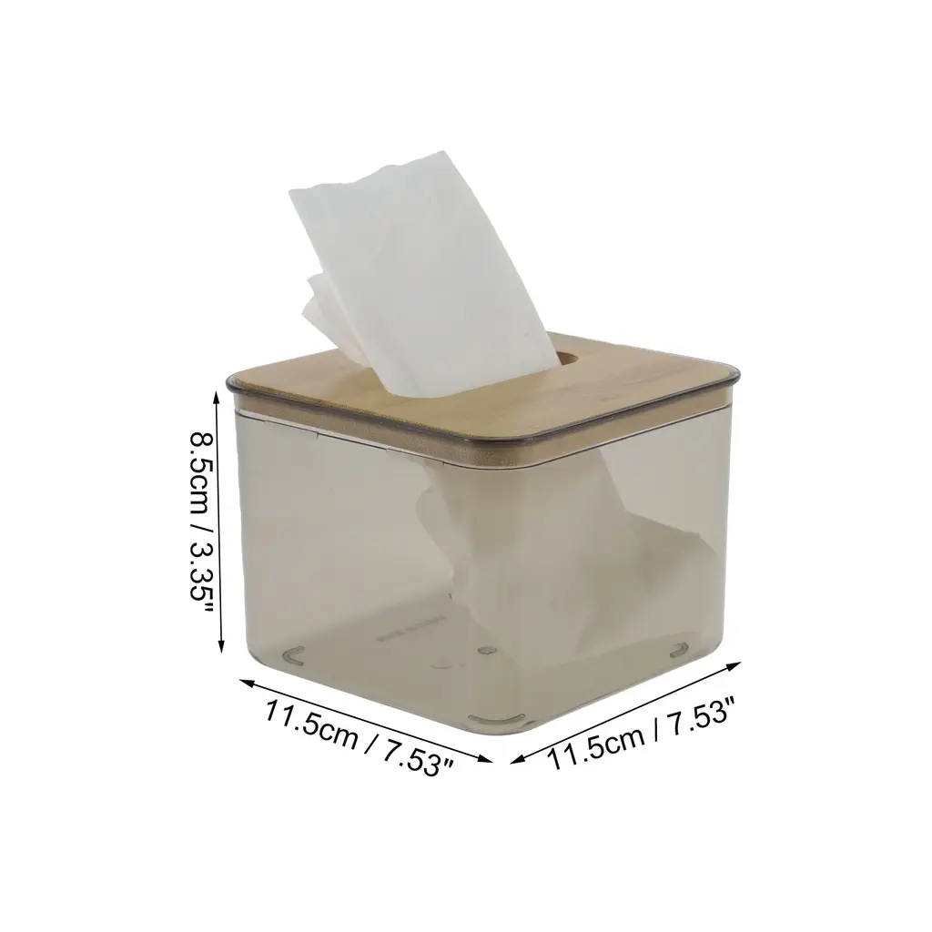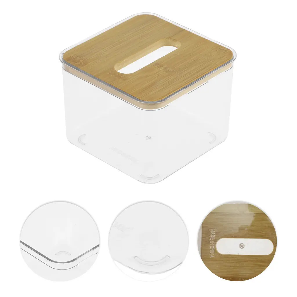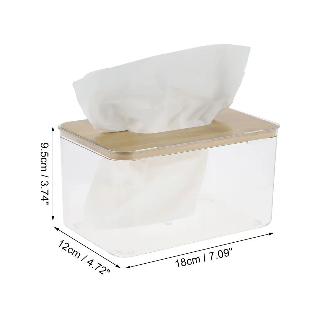 Features:This tissue box cover is designed in minimalist style, and made with good quality materials. A stylish home decoration accessory for your living room, bedroom nightstand, countertop, toilet, bathroom, laundry room, car and etc.Convenient to hide or replace broken and damage tissue boxes. Easy to store and refill new tissues.Please Note: Please allow 1-3mm measuring deviation due to manual measurement. Specifications: Product Name: Tissue BoxColor: ClearMaterial: PET, Bamboo Size: 11.5x11.5x8.5cm / 7.53"x7.53"x3.35"(L*W*H)Package List: 1 Pc Tissue Box