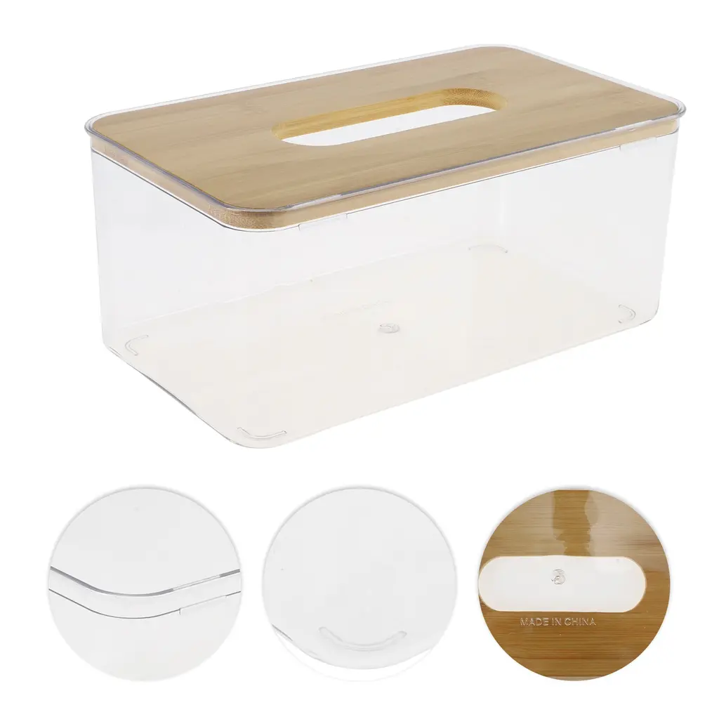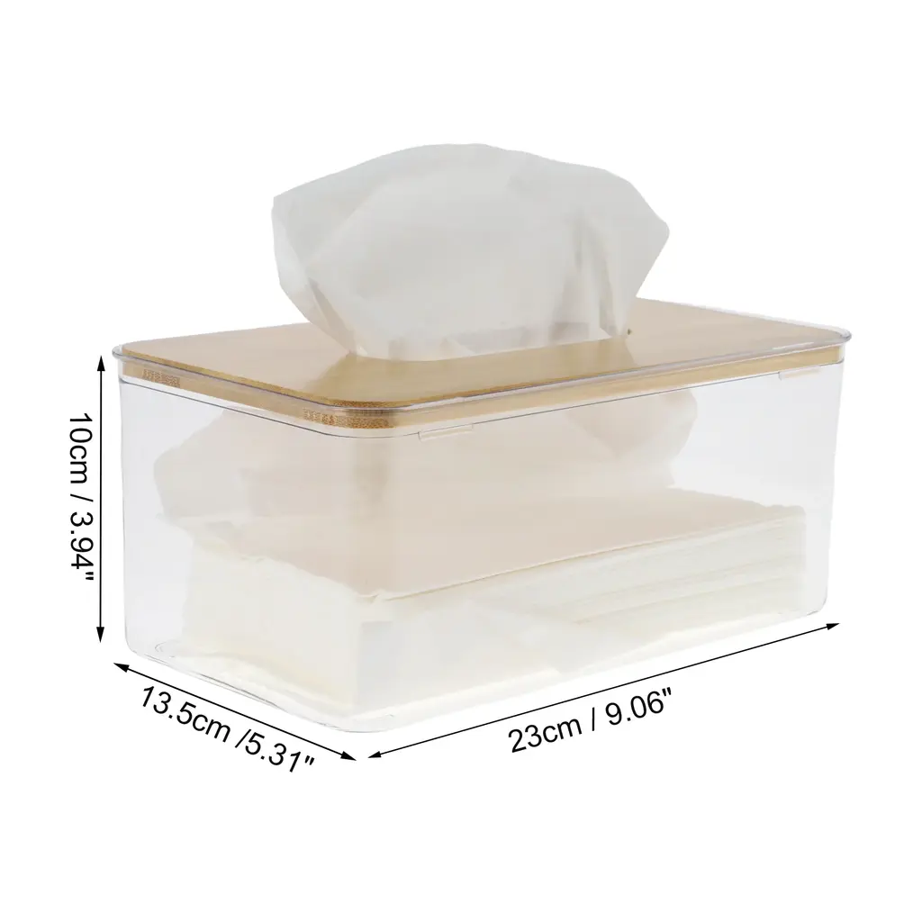 Features:This tissue box cover is designed in minimalist style, and made with good quality materials. A stylish home decoration accessory for your living room, bedroom nightstand, countertop, toilet, bathroom, laundry room, car and etc.Convenient to hide or replace broken and damage tissue boxes. Easy to store and refill new tissues.Please Note: Please allow 1-3mm measuring deviation due to manual measurement. Specifications: Product Name: Tissue BoxColor: ClearMaterial: PET, Bamboo Size: 23x13.5x10cm / 9.06"x5.31"x3.94"(L*W*H)Package List: 1 Pc Tissue Box