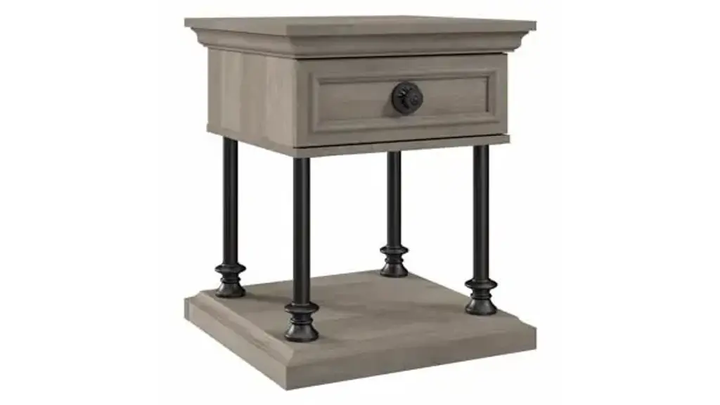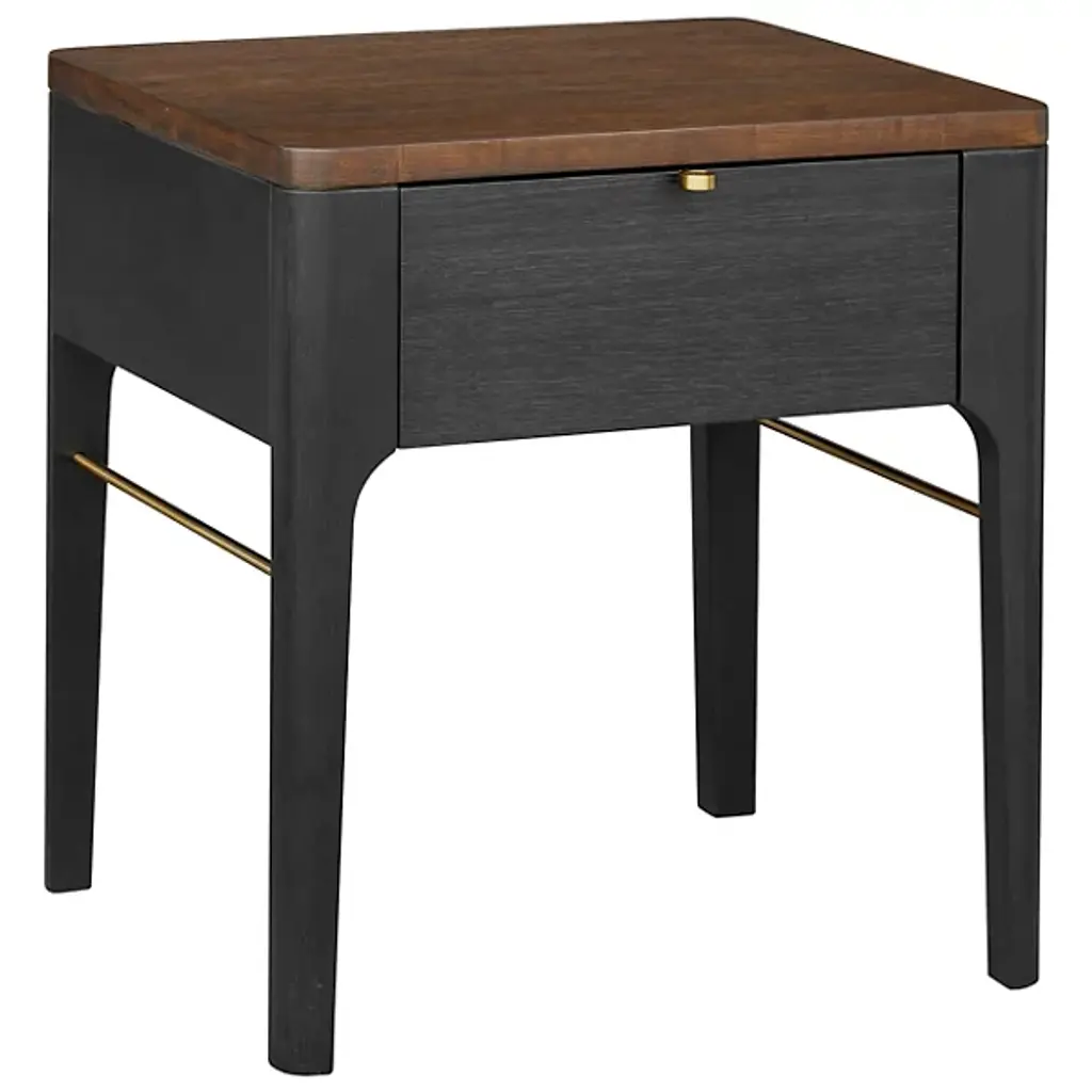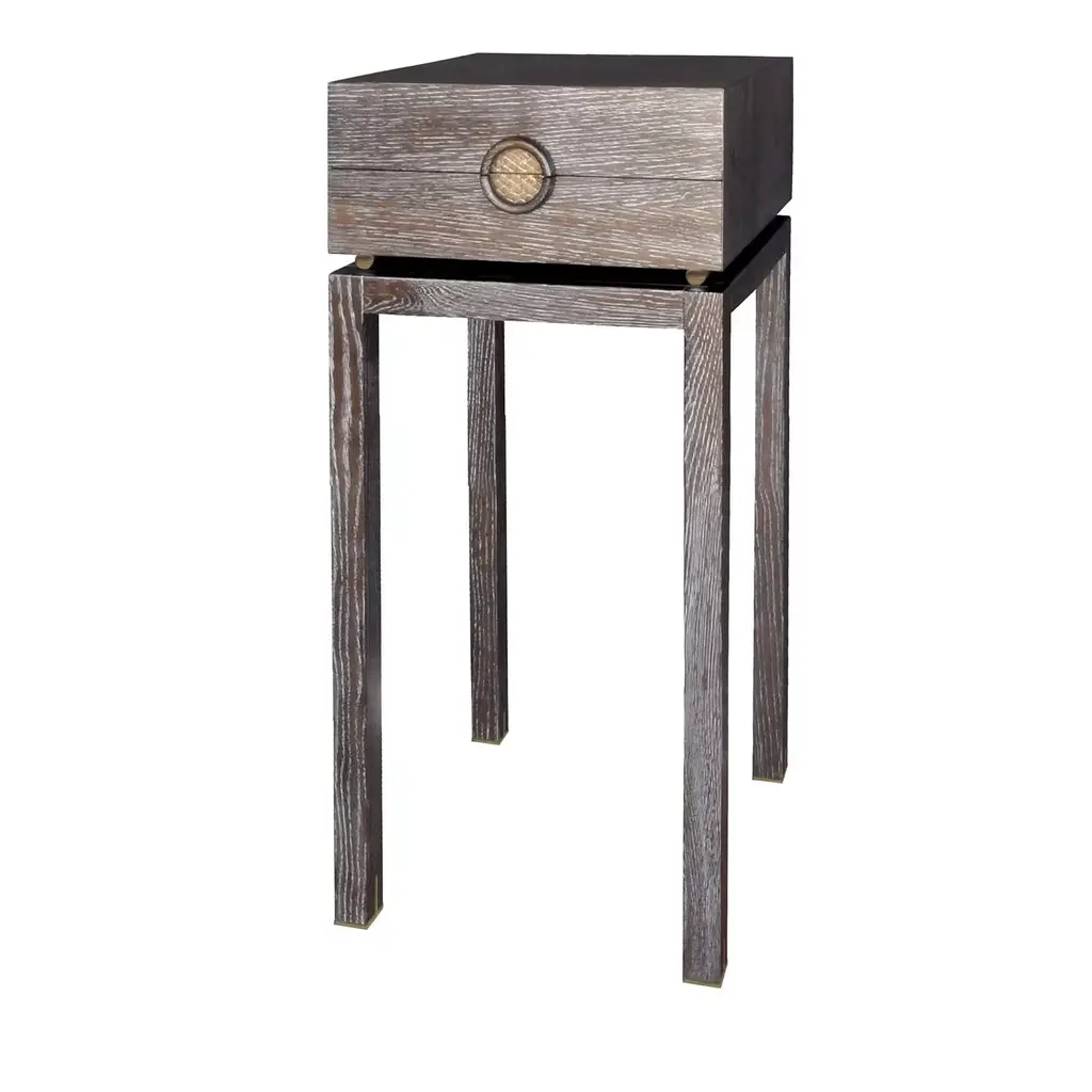 Either as a nightstand or sidled up beside a sofa, this tall table makes a stylish statement with its simple and sleek silhouette crafted of stained oak in silver and chocolate brown. Galvanized bronze spacers suspend the top from the four-legged base and a ring-shaped handle in the same finish encompasses the edge of the two soft-close drawers adding a subtle glint of glamour.