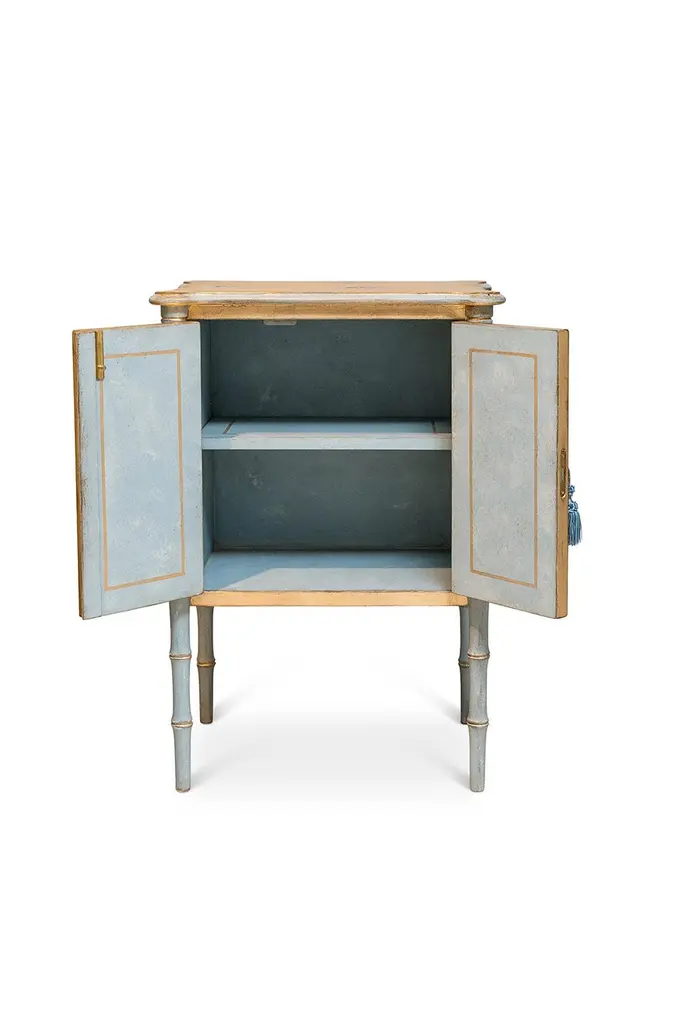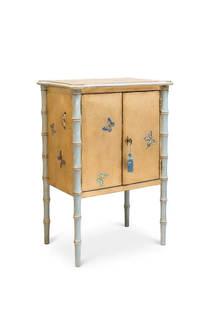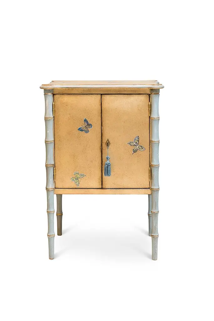 From our Hand-Painted Furniture Collection, we are pleased to introduce you to our Bamboo Lombardia Nightstand, in gold with butterflies decor. Did you know that a group of butterflies is called a kaleidoscope? The name comes from the beautiful array of colors and pattern created by many fluttering wings. We've always had a love of butterflies, as evidenced by their presence in a few of our decors. Their delicate nature and eye-catching beauty captures our hearts again and again. And then, what if we capture this beautiful light decor to the whimsical silhouette of a bamboo nightstand, in a full gold background, making your bedroom a joy for the eye, with every sun kiss of each new morning? Like each one of our pieces, also this Bamboo Lombardia Nightstand may be customized with any color and decoration according to our customers’ requests. Each piece from our Collections is in fact entirely hand-painted on every side by using the very best 18th Century Craftsmanship Venetian Techniques, passed down through the generations of artists from our land. On request, extra protection can be applied to the top.