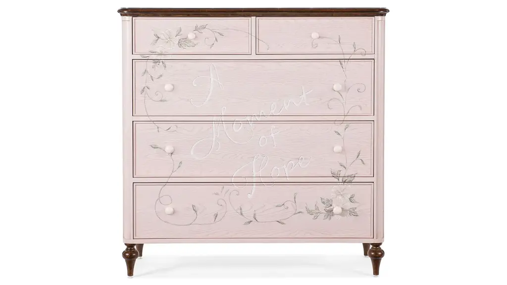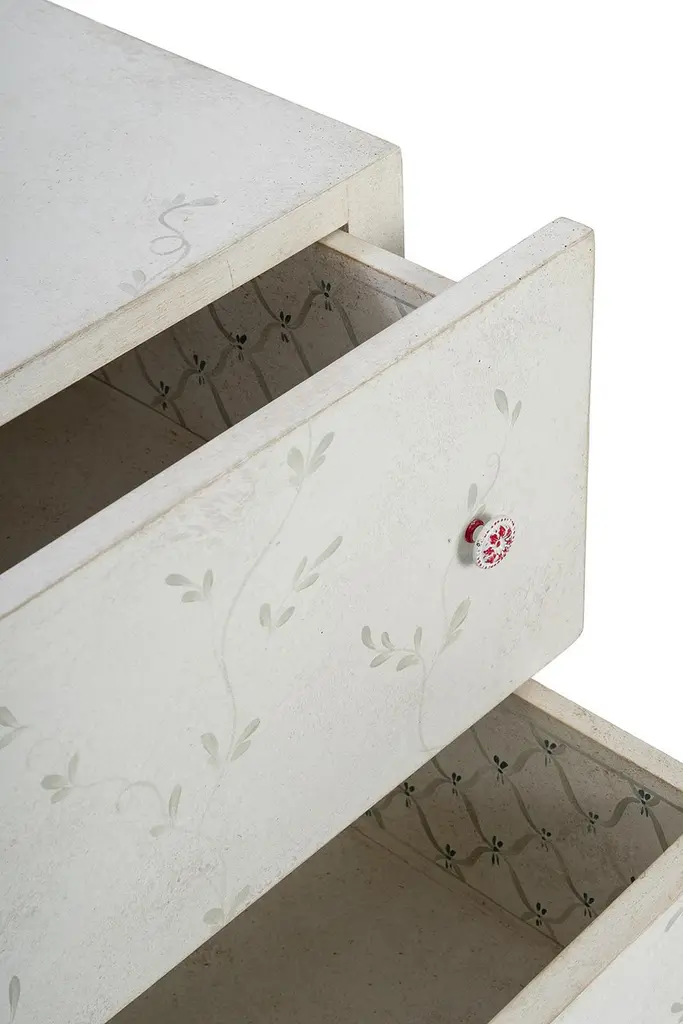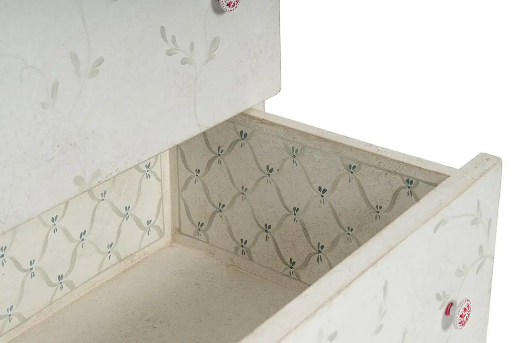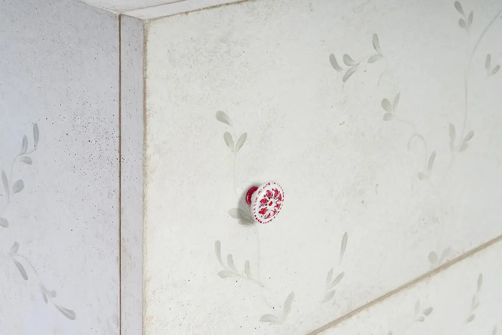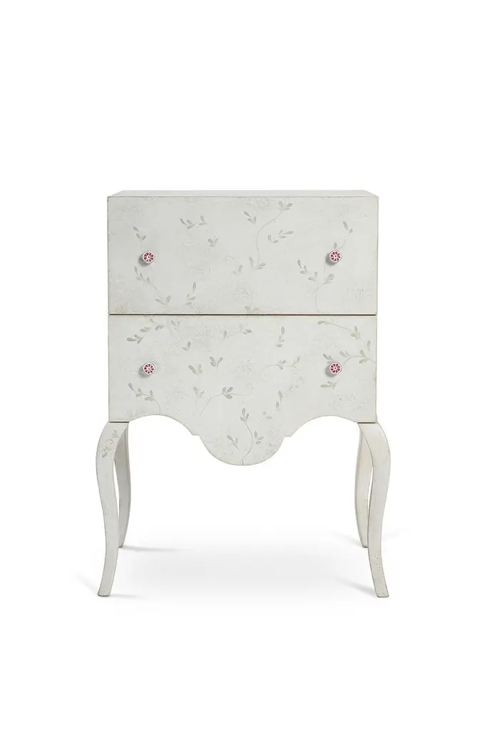 From our hand-painted furniture collection, we are pleased to introduce you to our beautiful Brenta Nightstand with hand-painted subdue blue branches and small leaves decor.Inspired by a feminine and minimal mood, the pink metal pulls and the light leaves decor create a magical atmposhere to complete your bedroom. This beautiful design is displayed all around the piece, just like the way the old-world decorators used to complete their bedside-tables. The magic continues inside each drawer where you will find our signature ribbons decor, visible everytime you will open up your drawers. Like each one of our pieces, also this Brenta Nightstand with drawers may be customized both in size and color according to our customers’ requests. On you request, extra protection can be applied to the top.
