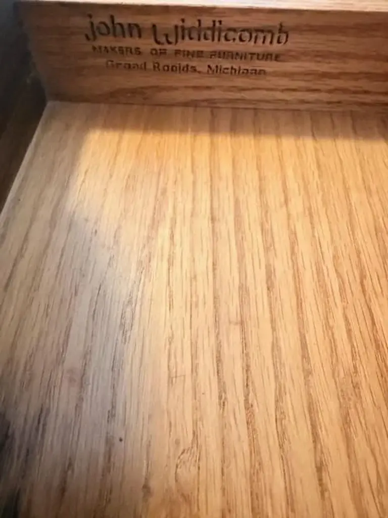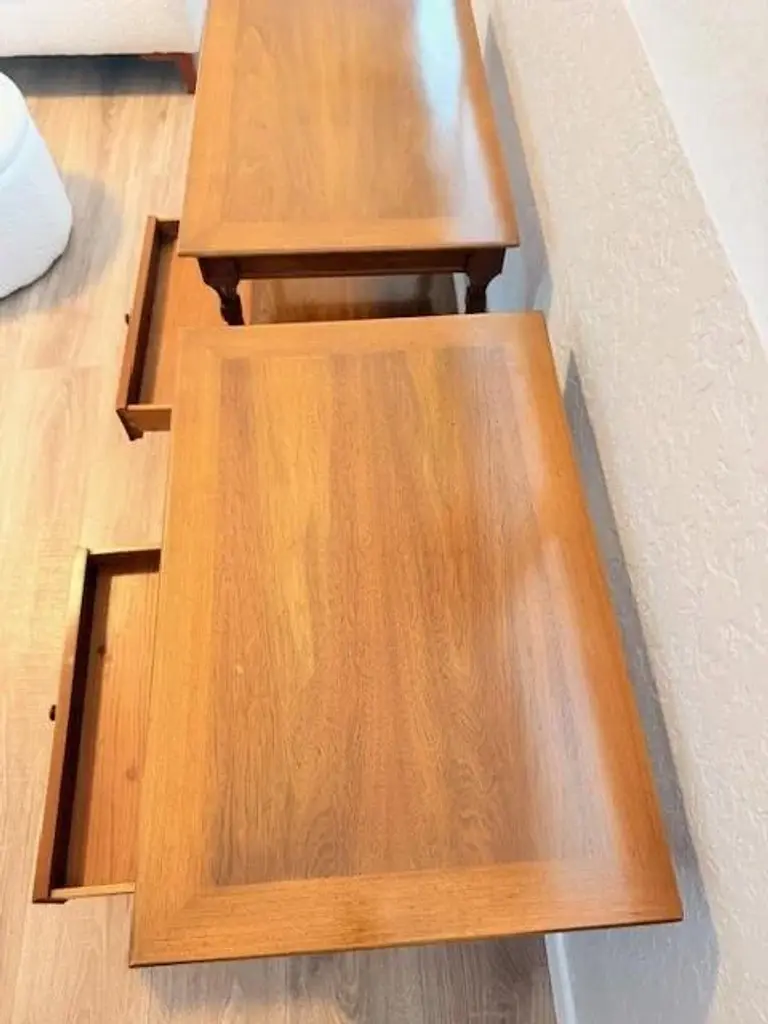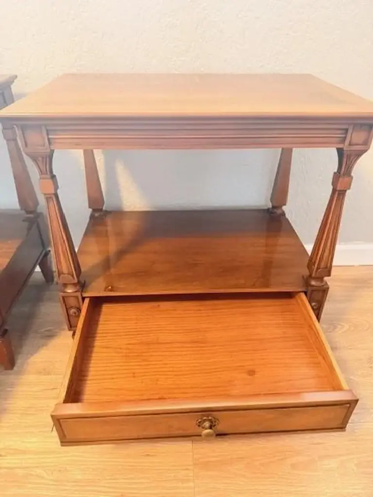 Crafted from richly toned wood and accented with striking brass hardware, these nightstands embody the clean lines and timeless elegance of mid-century modern design. Each features a spacious drawer with original hardware and an open lower shelf, offering both style and function.