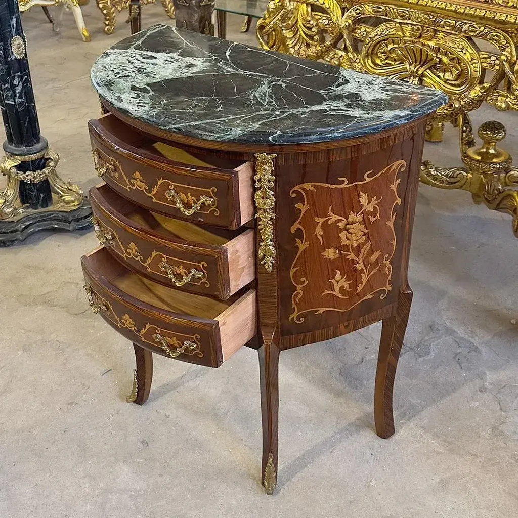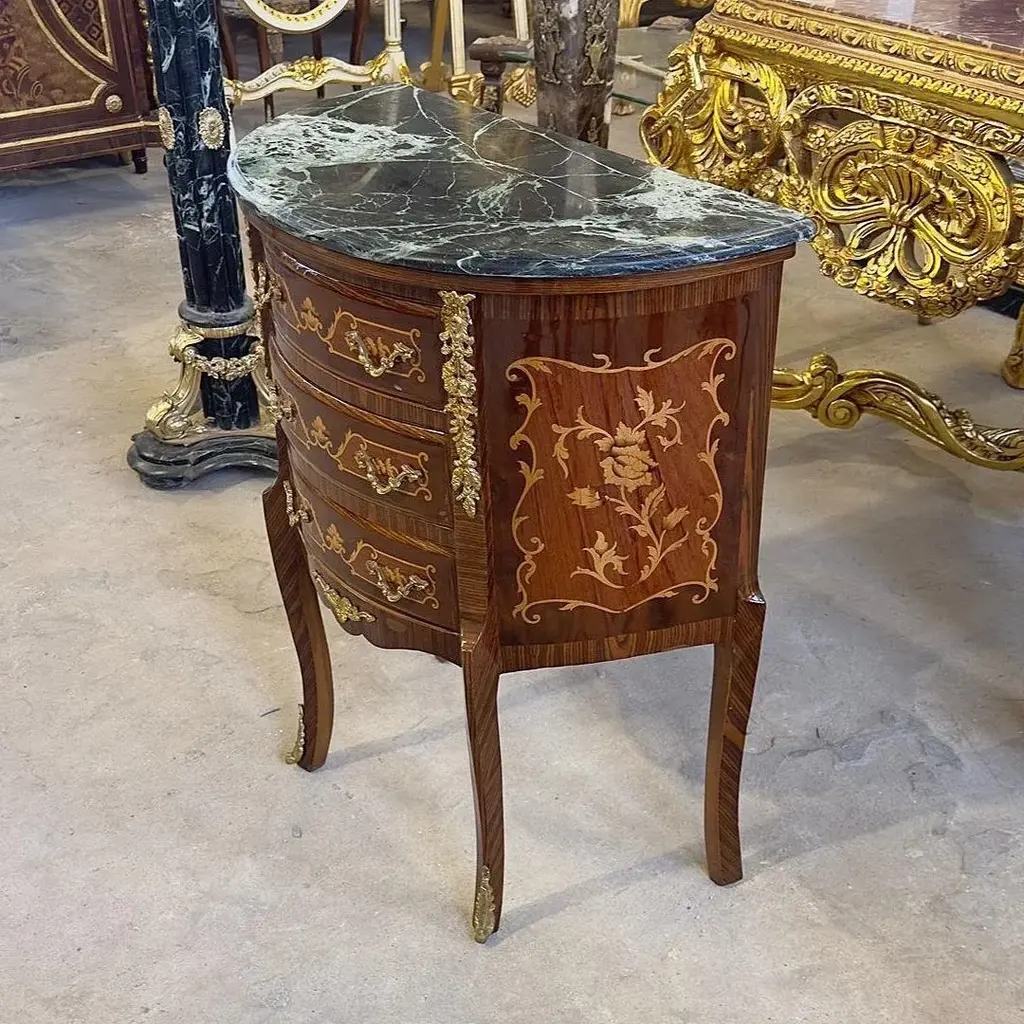 Elevate your home decor with this enchanting commode. The commode has 3 drawers decorated with gold handles and beautiful details. Stunning French commode that can be used as a nightstand, perfect for a romantic and vintage look. At the top it has a piece of black marble.
