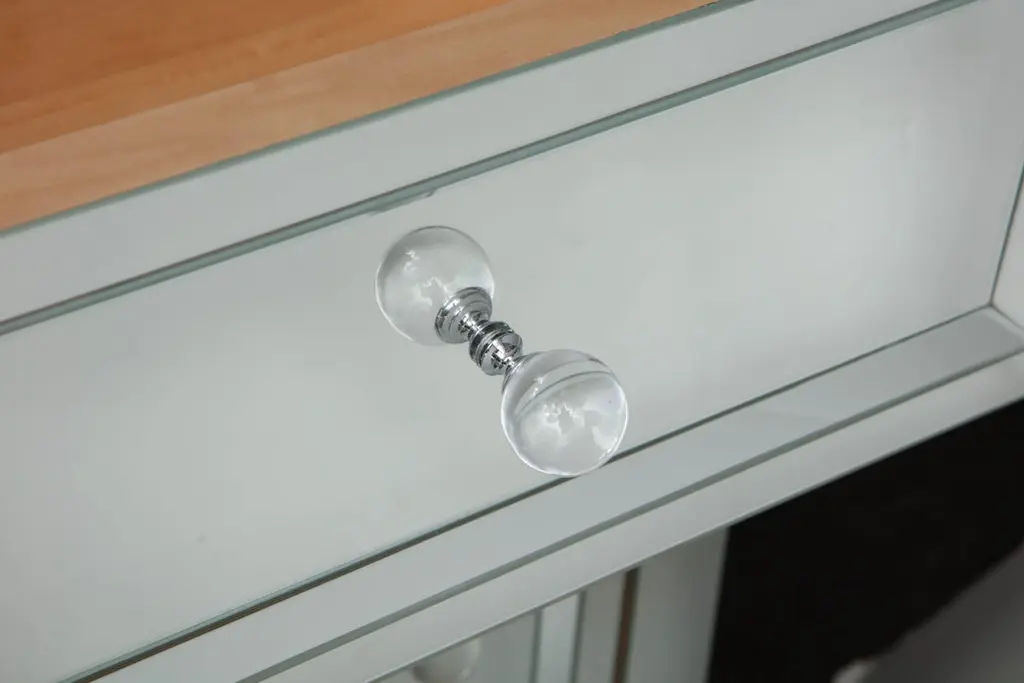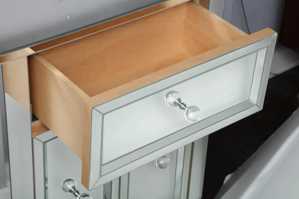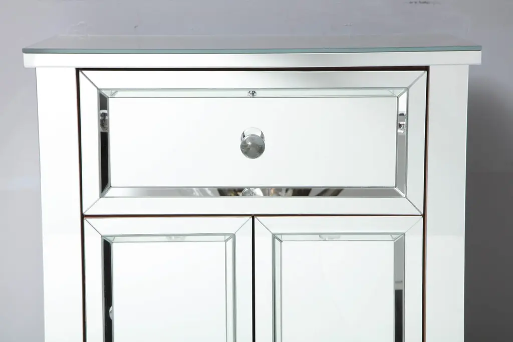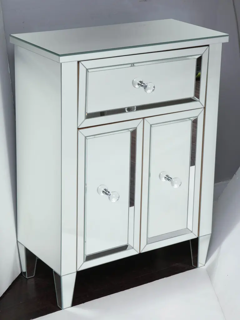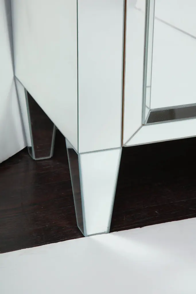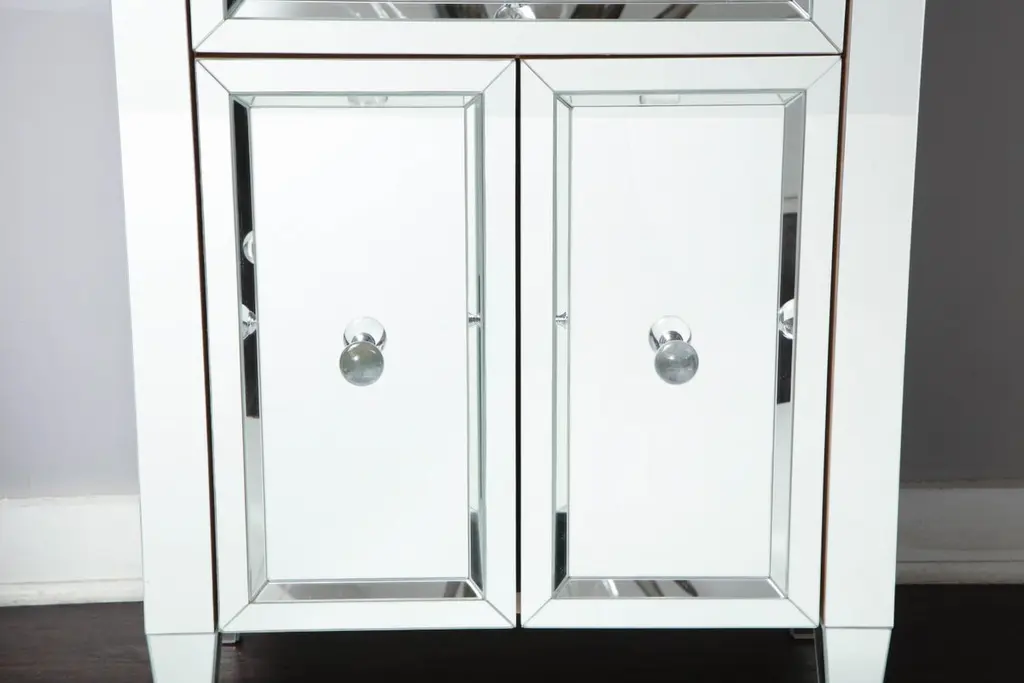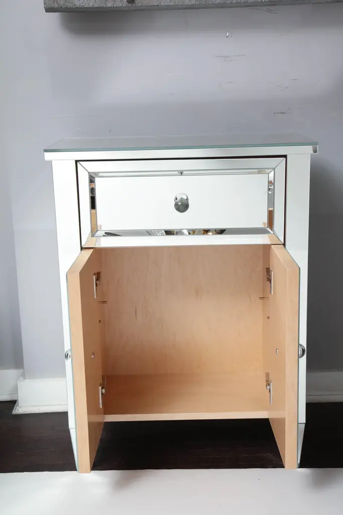 Custom 2-door mirrored nightstand with a single drawer. Customization is available in different sizes, hardware, and mirror finishes.Currently out of stock but available for custom order. Please inquire for estimated production lead times.DimensionsHeight: 32 in. (81.28 cm)Width: 24 in. (60.96 cm)Depth: 12 in. (30.48 cm)Condition: New and made to order