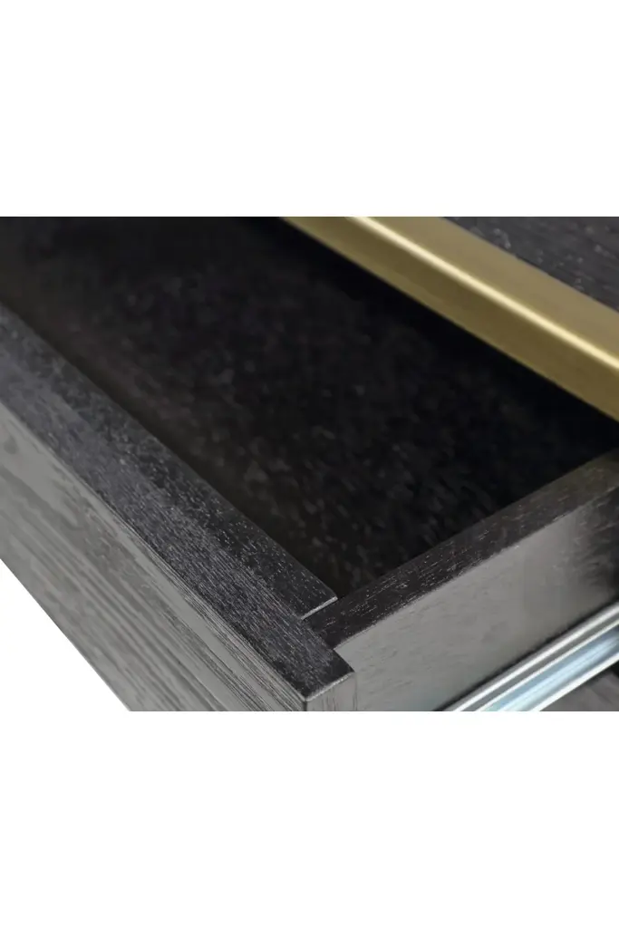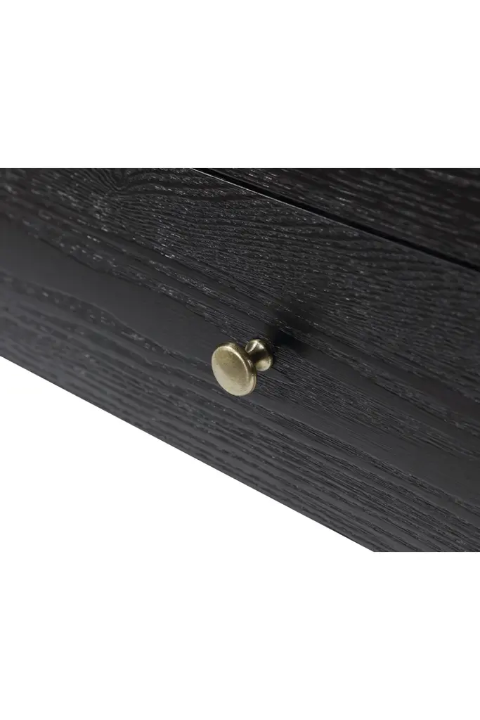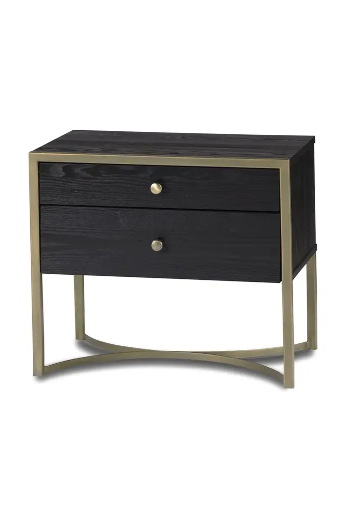 Bring brooding beauty to the boudoir with the Rivoli Bedside Table. Devotedly designed and carefully crafted by interior experts, the Rivoli works a wondrous palette of black and gold thanks to its captivating components of black ash veneer and beautiful brass finish. Boasting two convenient storage drawers ideal for those everyday essentials, the Rivoli ensures an organized and efficient abode.(Metal items are intended to have a rustic appearance that may include spotting and variances in tone and lustre.)