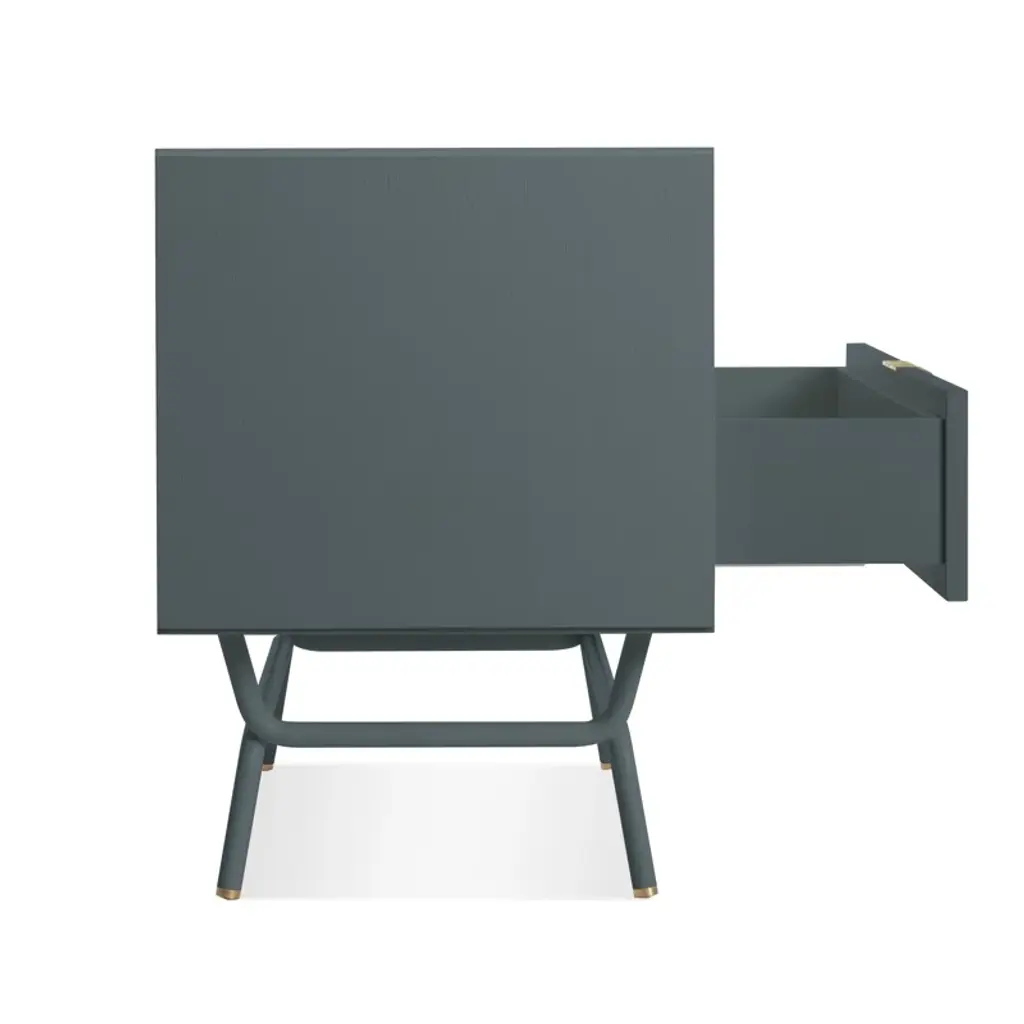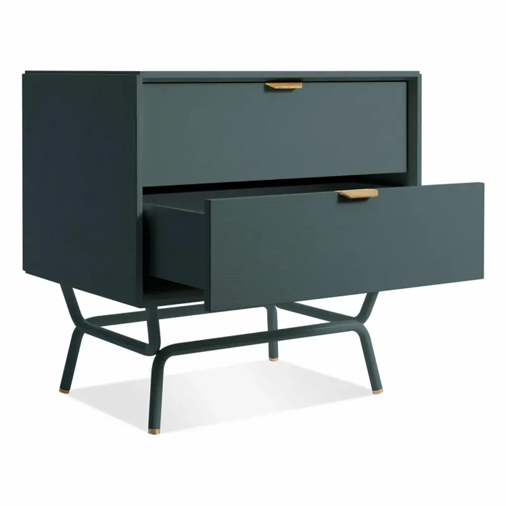 This nightstand’s decorative details draw on understated mid-century modern design. Its facade showcases alternating wood grain patterns, accented by an asymmetrical split square handle in an antique brass finish + matching metal legs. Two soft-close drawers keep essentials close at hand.