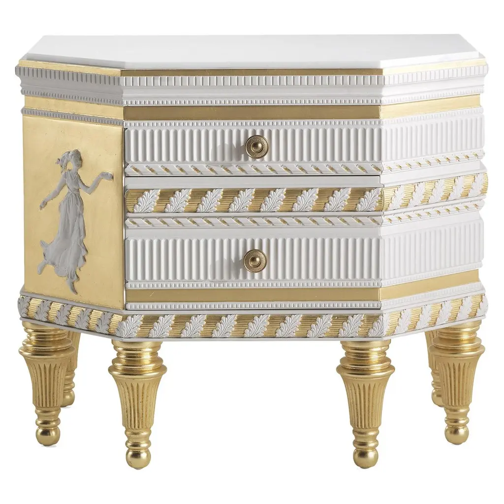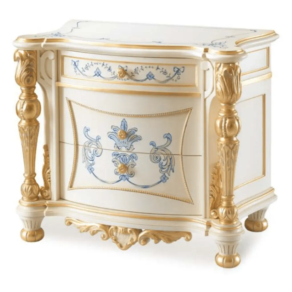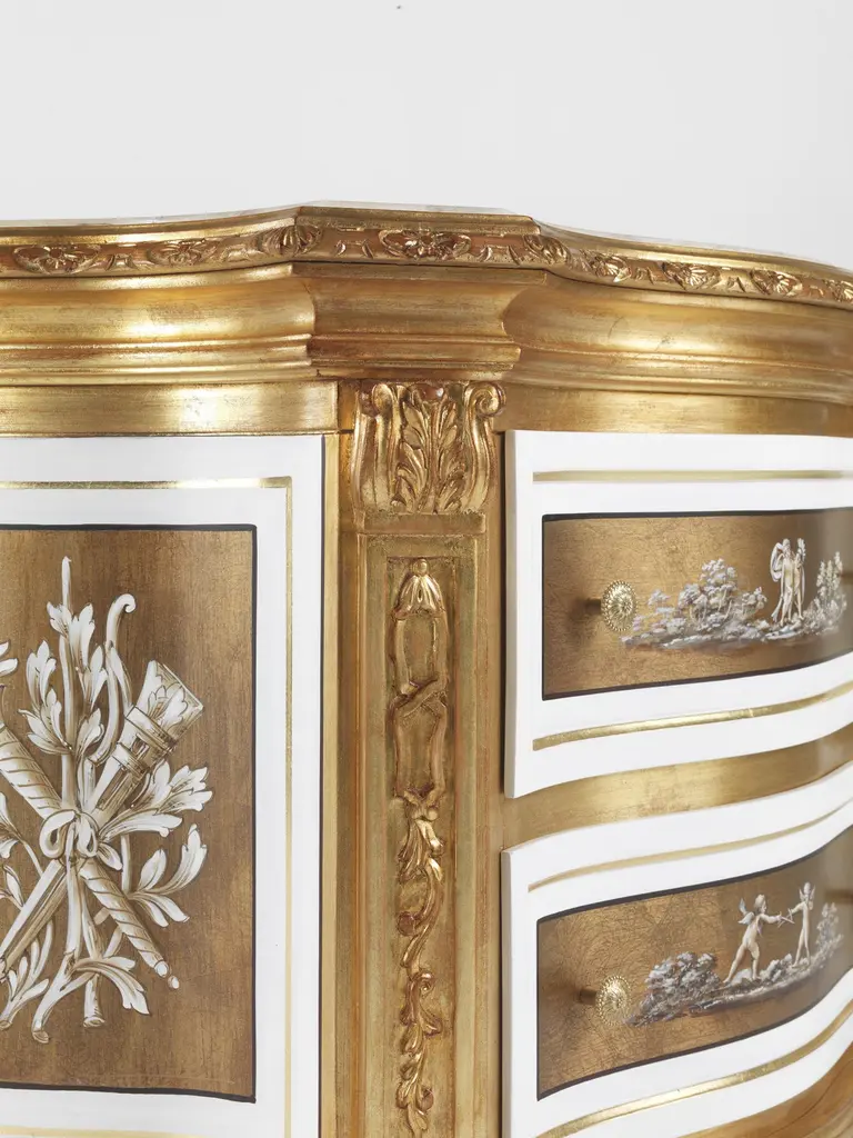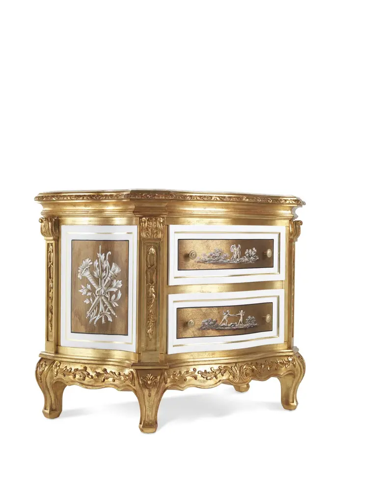 A line of furnishings in Baroque style, the perfect expression of Jumbo Collection’ decorative spirit and craftsmanship heritage.The night tables of the line are characterized by a beechwood structure, with low-relief carvings finished in antique gold leaf with white and gold decorations inspired by neoclassical tradition, while the top is in precious onyx.Fragonard Baroque-style night table with structure in beechwood. Low relief carvings, finished in antique gold leaf with white and gold decorations JG291. Top in Cloudy Onyx.
