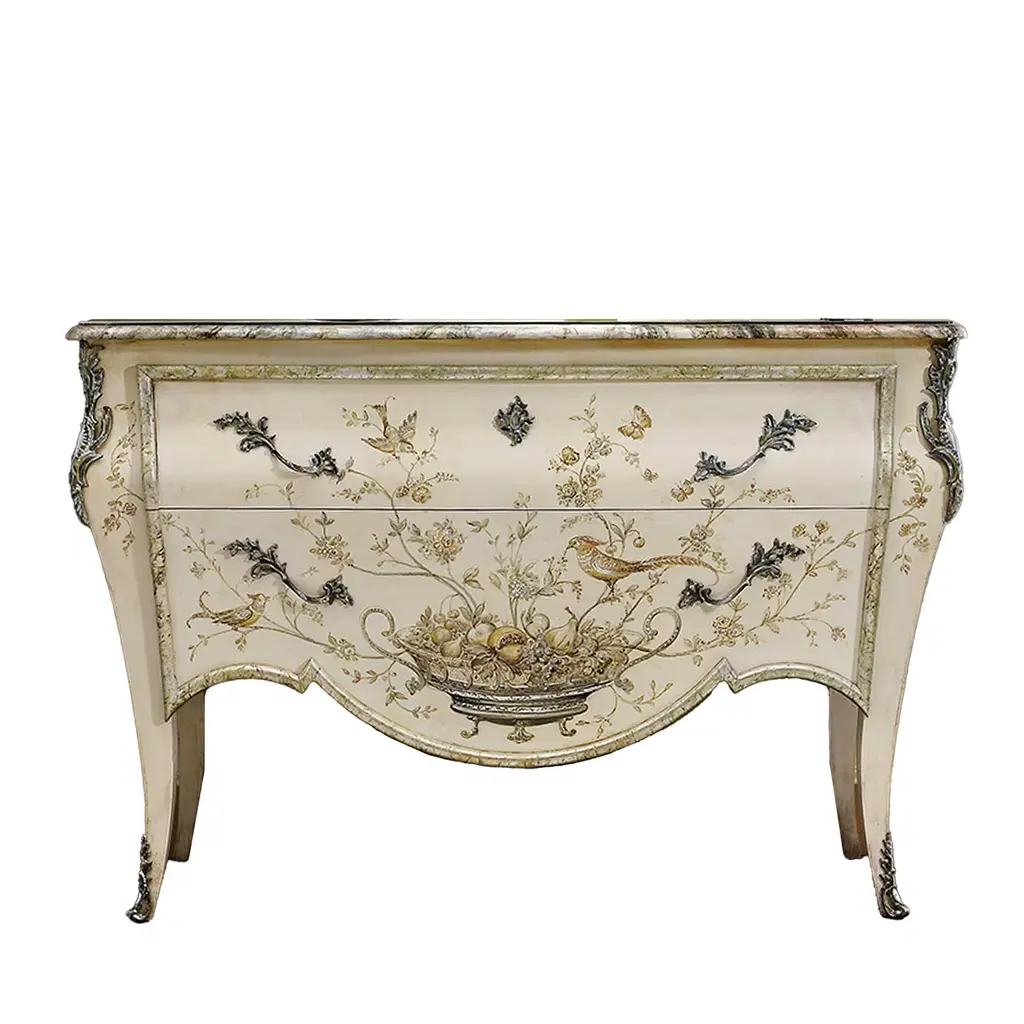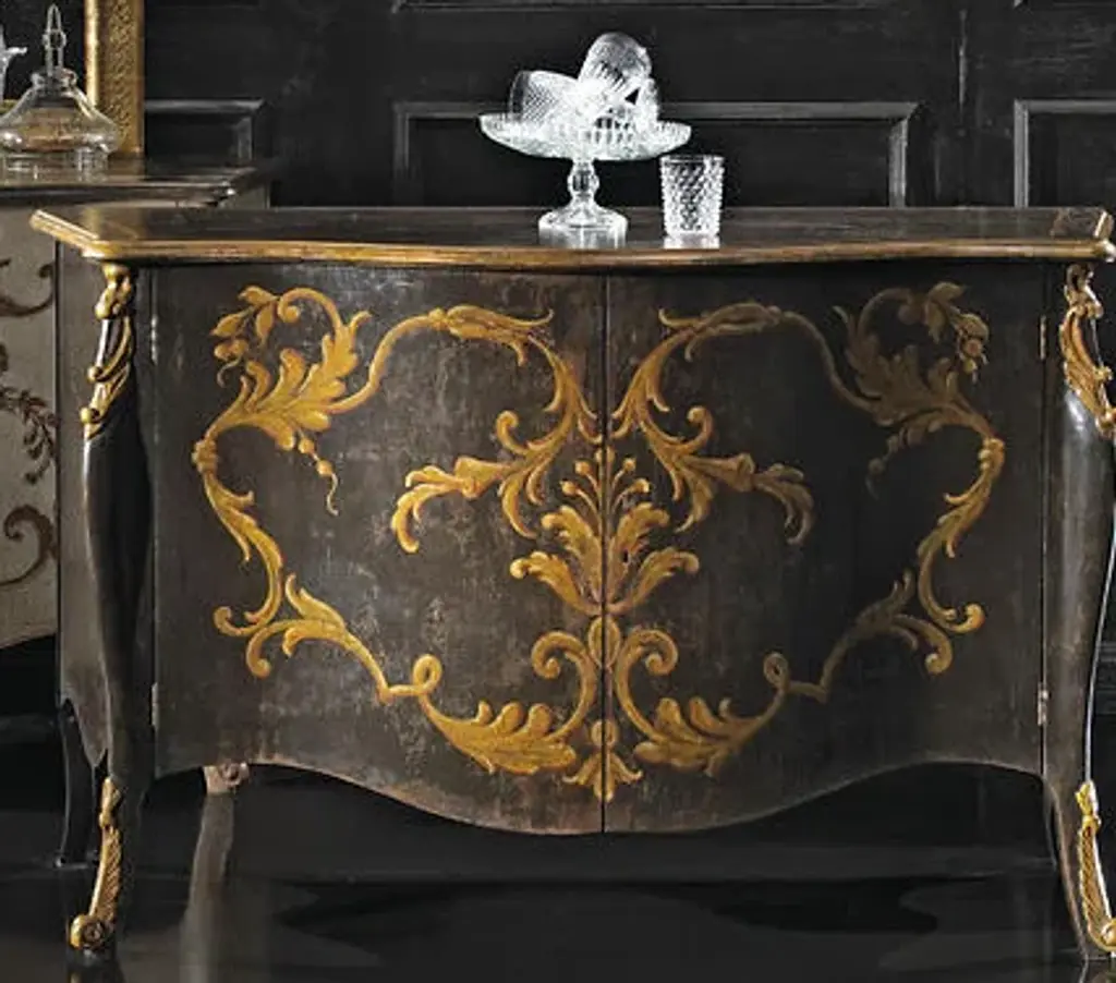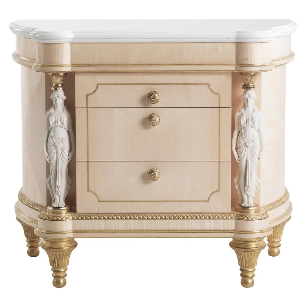A line of furnishings in Baroque style, the perfect expression of Jumbo Collection’ decorative spirit and craftsmanship heritage.The night tables of the line are characterized by a beechwood structure, with low-relief carvings finished in antique gold leaf with white and gold decorations inspired by neoclassical tradition, while the top is in precious onyx.Fragonard Baroque-style night table with structure in beechwood. Low relief carvings, finished in antique gold leaf with white and gold decorations JG291. Top in Cloudy Onyx.