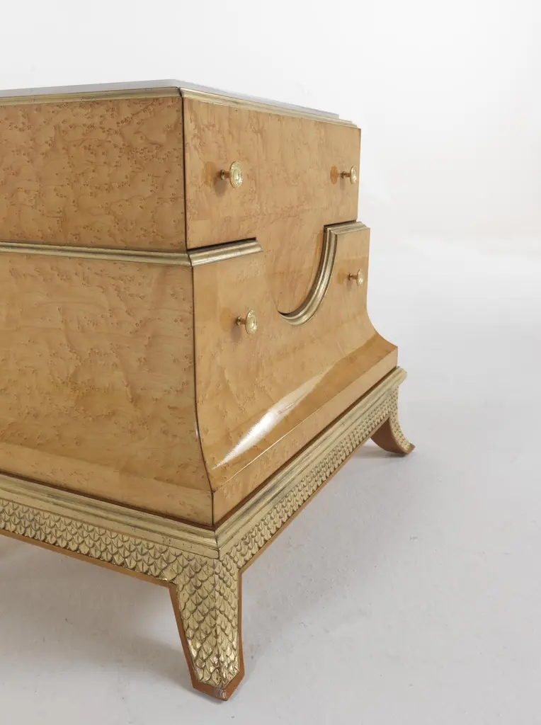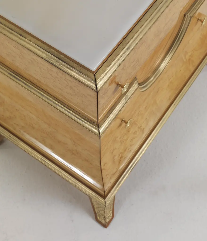 Pleasure is a line of furnishings with linear and essential shapes, characterized by an elegant and refined charm. The night tables of the collection, in deco style, feature a structure in maple with glossy finishing, details with antique gold finishing and marble top.Pleasure Night table with structure in multilayer erable bird's eye maple with glossy finishing. Detail finished in antique gold JG286. Top in white Namibia Rhino marble.