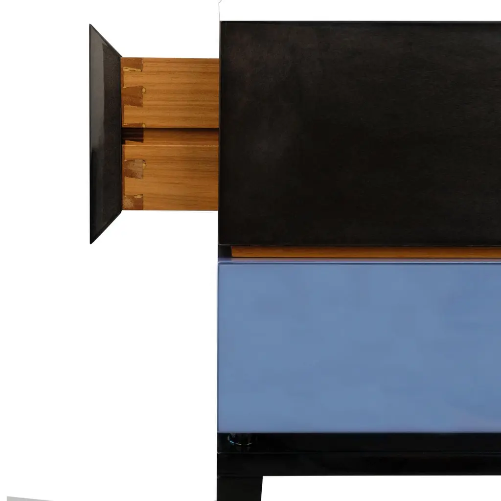 The Proportion II nightstand is a gracious tribute to one of the pioneers of modern architecture: Mies Van der Rohe. This German-american architect and director of the Bauhaus strove towards an architecture with a minimal framework of structural order balanced against the implied freedom of unobstructed free-flowing open space. Proportion II Nightstand combines an eccentric and luxurious mix of black lacquer over silver leaf, radiant orchid lacquer over gold leaf, petrol blue lacquer and caviuna wood. The interior owes its softness to the satinwood. The base remains robust with solid wood lacquered in piano black, making it the masterpiece of your luxury bedroom décor. Proportion II Nightstand was designed by Malabar and is part of the World Architects Collection.