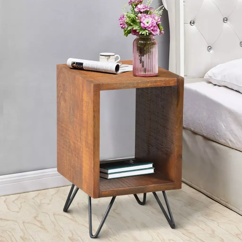 Organized your bedtime essentials within your reach by bringing this industrial style Nightstand, featuring fine craftmanship. Sturdily constructed, this nightstand features cube shape open acacia wood compartment supported on tubular metal legs that offer stability. Showcases rough hewn saw texture detail gives it a rustic appeal. Due to the handcrafted nature of the product, there may be variation in color, finish, wood grain and knots.