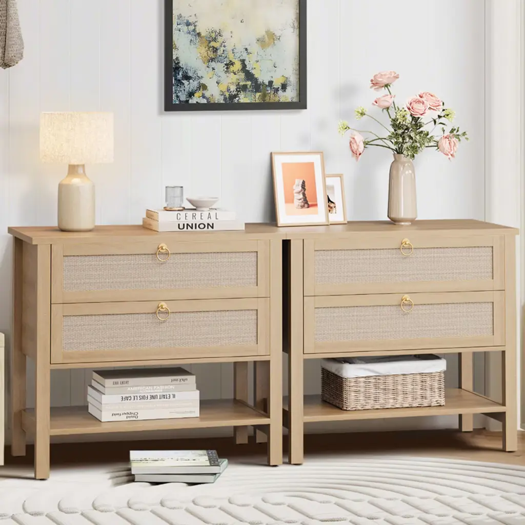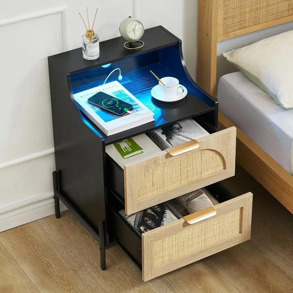 【ELEGANT RATTAN NIGHTSTAND】This rattan nightstand features a refined design that combines both style and function. The warm natural tones and textures enhance the overall aesthetic of your bedroom while adding a touch of elegance to your space. It’s an inviting addition to any decor style. 【CONVENIENT NIGHT STAND WITH CHARGER STATION】Equipped with a built-in night stand with charger station, this furniture piece includes multiple outlets and USB ports, making it easy to charge your devices overnight. This functionality helps reduce clutter while keeping your essentials powered and within reach. 【SLEEK BLACK NIGHTSTAND】The black nightstand offers a contemporary look that fits seamlessly into various bedroom themes. The stylish finish not only enhances visual appeal but also complements your bedroom night stand, creating a cohesive and modern atmosphere. 【MULTIFUNCTIONAL BEDSIDE TABLE】This versatile bedside table serves multiple purposes, functioning as both a nightstand and a companion piece in your living area. Its design ensures it enhances any room, providing ample top space for personal items and decor, while easily adapting to your needs. 【INNOVATIVE LED NIGHTSTAND】Enhance your room's ambiance with the included LED nightstand feature. This modern element allows for custom lighting options, creating the ideal mood for reading or relaxing, while showcasing the black night stand’s modern design. 【SPACIOUS NIGHT TABLE FOR BEDROOM】With well-thought-out storage solutions, this night table for bedroom includes spacious drawers that glide smoothly, offering easy access for your belongings. It enhances organization and convenience, making it an ideal choice for a tidy living space.