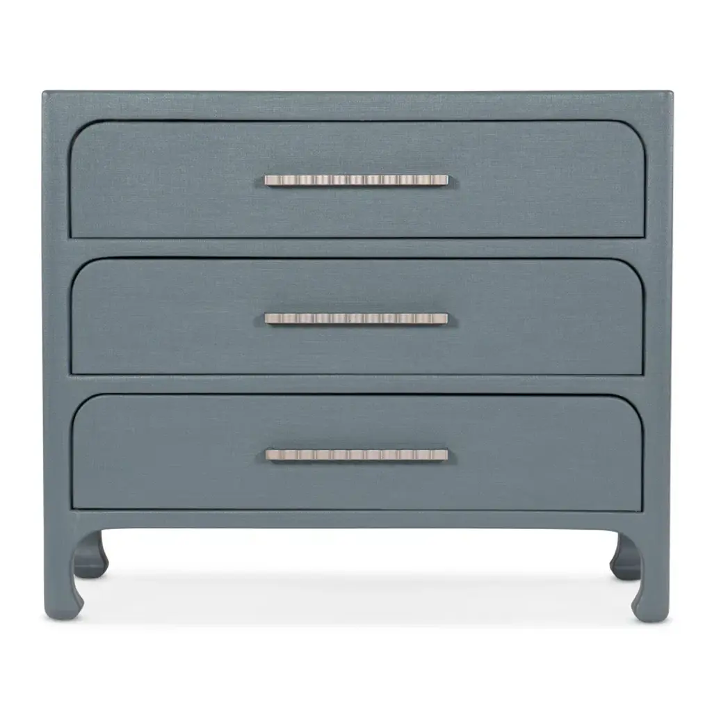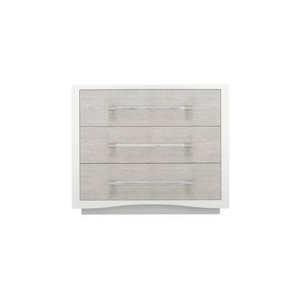 A glamorous take on a casual style, this three-drawer chest introduces a refined mix of organic textures, materials, and metallic finishes. Raffia-wrapped drawer fronts in a Sun-kissed Silver bring to light the natural beauty and texture of this intricately woven material. Clear acrylic rod pulls capped in Satin Nickel finish the look with an element of distinction. Perfectly scaled for use as a hallway chest, oversized nightstand or focal piece along a wall beneath a favorite work of art.