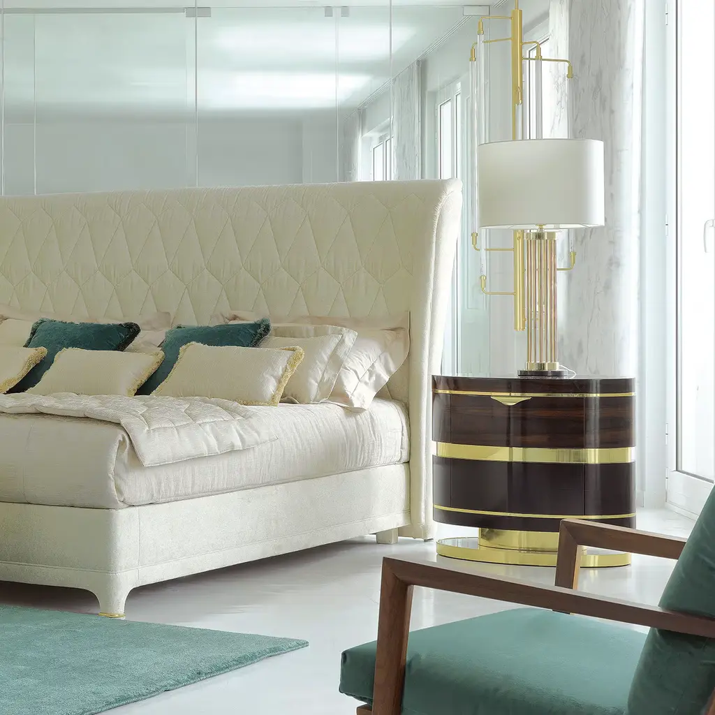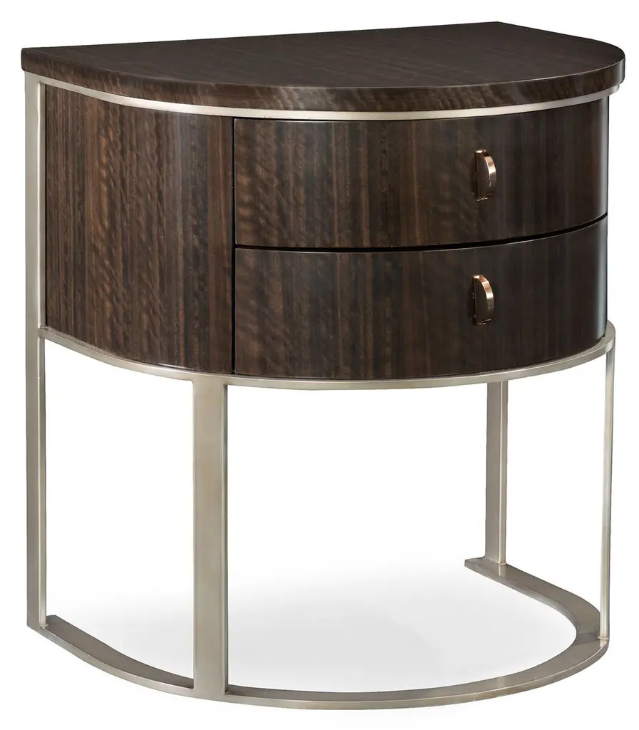 Combining the dark elegance of ebony with the strikingly large grain of the ziricote wood, this oval nightstand is a stunning piece of functional decor that will enrich the look of any bedroom. The bold structure rests on a base in brass, which occurs also in the metal details and in the handle of the drawer. The base boasts inserts of Corteccia marble for a luxurious final effect.