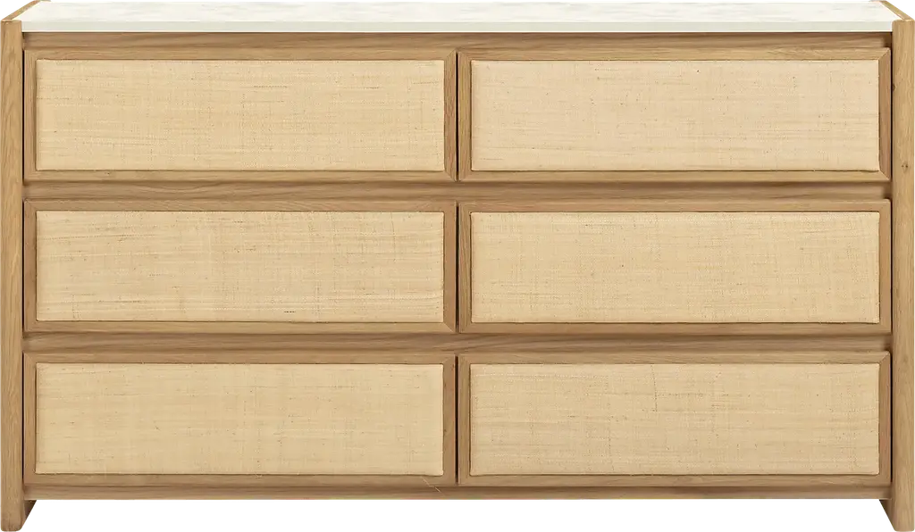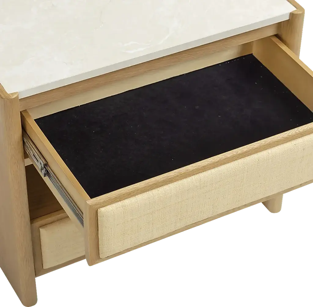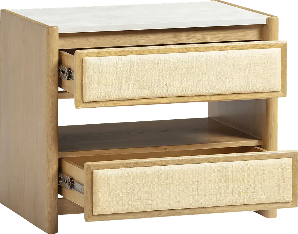 The Acecloud natural nightstand channels mid-century form with a tropical twist. Solid white oak frames, padded raffia drawer fronts, and creamy faux marble tops create a clean, sun-drenched palette that's rich in texture and easy to live with. No sealing, no staining, just timeless style made simple.